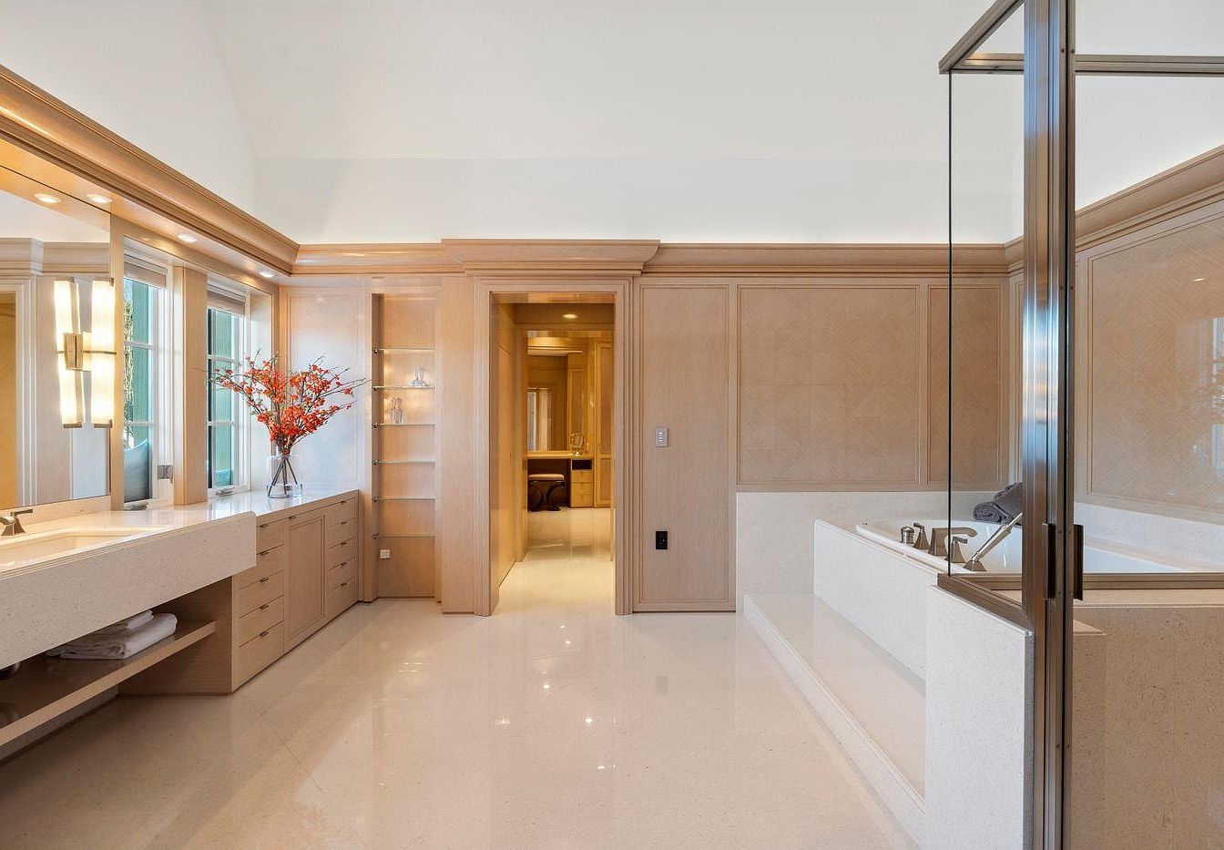 This elegant bathroom showcases a modern layout defined by clean lines and a serene atmosphere. The spacious design features a sleek vanity with ample storage, highlighted by pale wood cabinetry and a polished countertop. Large windows invite natural light, enhancing the soothing color scheme of soft whites and warm neutrals. A luxurious soaking tub complements a glass-enclosed shower, offering relaxation and functionality. Thoughtfully placed shelves add decorative flair, while the minimalist architecture and pristine floors contribute to an overall sense of tranquility. Ideal for family living, this bathroom balances aesthetic appeal with practical design.