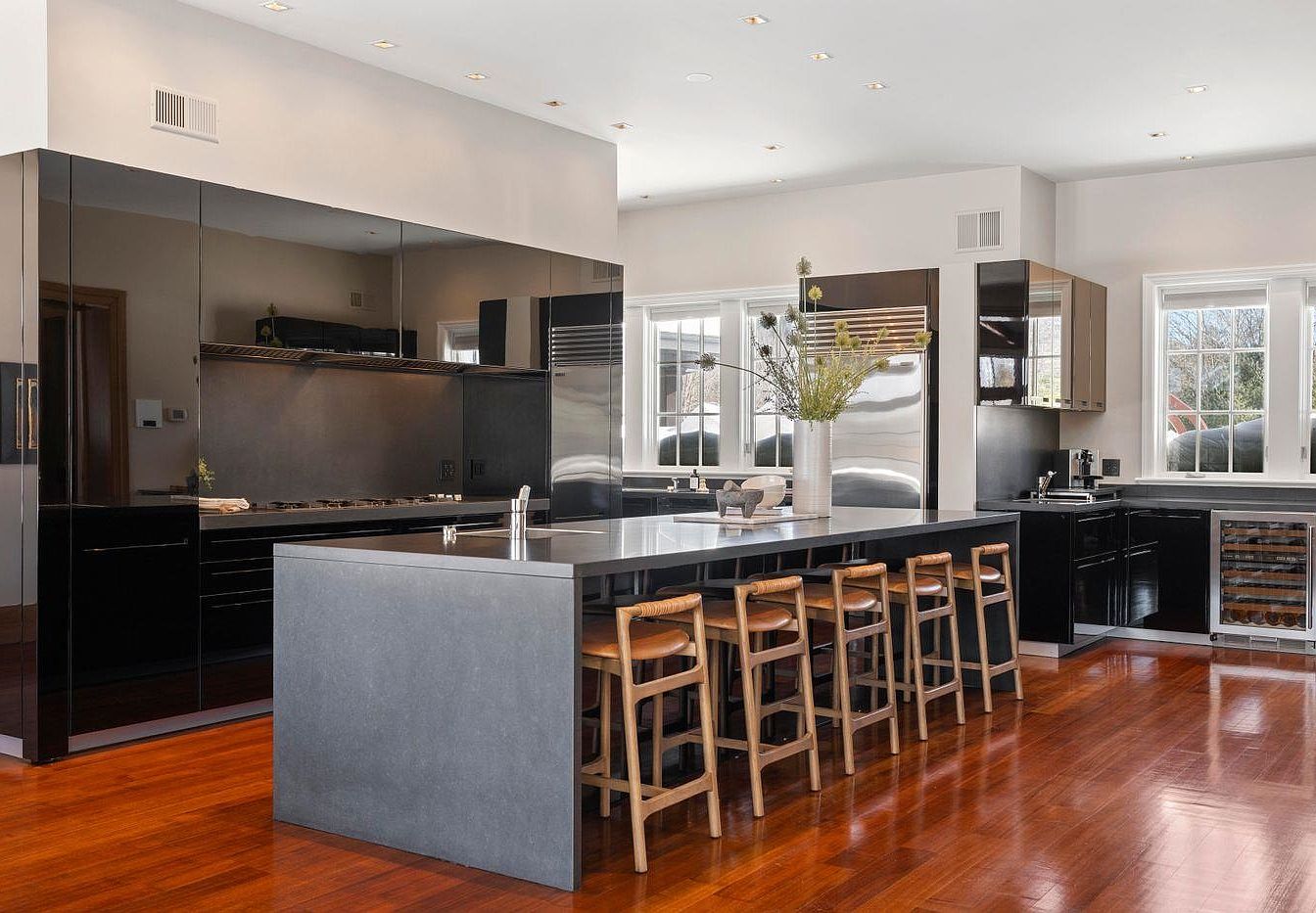 Featuring a modern open layout, this kitchen is an epitome of contemporary design. The glossy black cabinetry complements the sleek stone countertop, creating a striking contrast with the warm, polished hardwood floors. A generous island with bar seating invites family gatherings and casual meals. Stainless steel appliances add a polished touch, while ample natural light from large windows enhances the spacious feel. Thoughtfully designed for functionality, the space includes a wine cooler and a well-positioned range for cooking enthusiasts. The minimalist aesthetic, combined with inviting elements, makes this kitchen both stylish and family-friendly.
