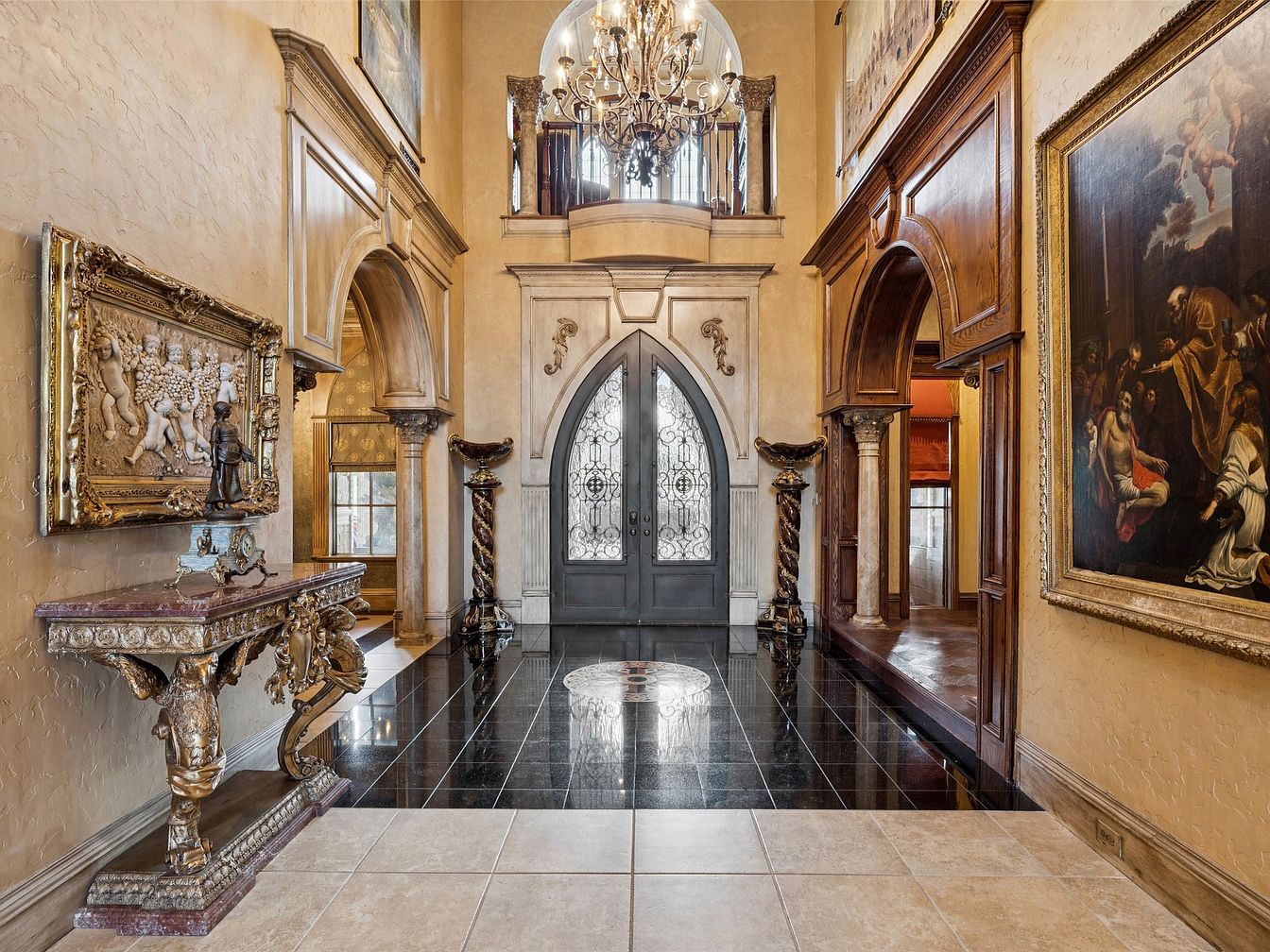 This grand entryway features an impressive open layout with high ceilings, accentuated by a magnificent chandelier that casts a warm glow. Elegant arched doorways lead into different areas, showcasing intricate architectural detailing. The polished black tiles reflect light beautifully, while cream-colored marble flooring adds a touch of luxury. Richly framed artwork adorns the walls, enhancing the sophisticated ambiance. A beautifully crafted console table provides a focal point while offering storage options. Family-friendly elements include ample space for movement and warmth in design, creating an inviting atmosphere that welcomes guests into this prestigious home.