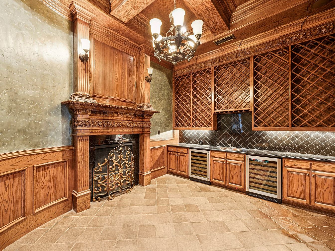This exquisite wine cellar features a stunning blend of rich wood paneling and elegant architectural elements. The intricately carved wooden mantelpiece above the fireplace adds a touch of grandeur, complemented by the warm, golden tones of the wall and ceiling. The diagonal tile flooring provides a classic foundation, while the sleek, modern wine coolers create a stylish contrast. Above, decorative lighting enhances the cozy ambiance, making this space ideal for entertaining or relaxation. The custom wine racks elegantly showcase bottles, ensuring easy access for any connoisseur, enhancing both functionality and aesthetic appeal in this luxurious setting.