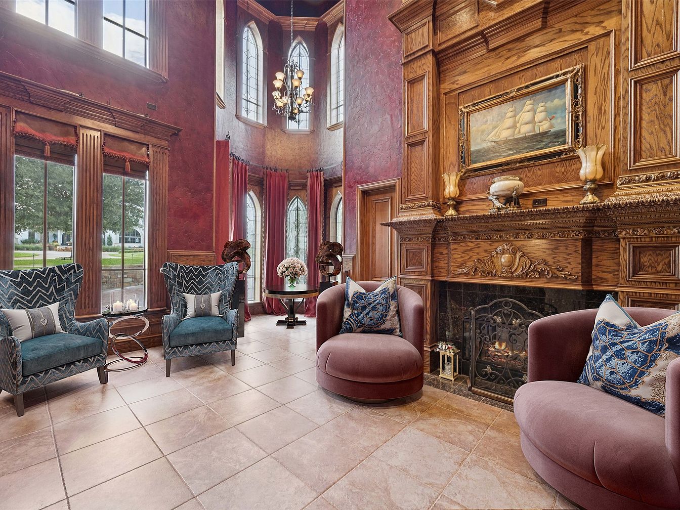This elegant living room showcases a blend of modern and traditional design elements, featuring high arched windows that allow natural light to flood the space, enhancing its airy atmosphere. Rich burgundy walls complement the elaborate wooden chimney breast, which houses an ornate fireplace beneath a classical painting. Plush, curvy sofas in soft mauve and blue accents invite relaxation, while the intricately patterned wingback chairs provide added seating comfort. Decorative pillows add a touch of sophistication. Overall, the warm color palette and meticulous architectural details create a welcoming environment perfect for family gatherings or quiet moments by the fire.