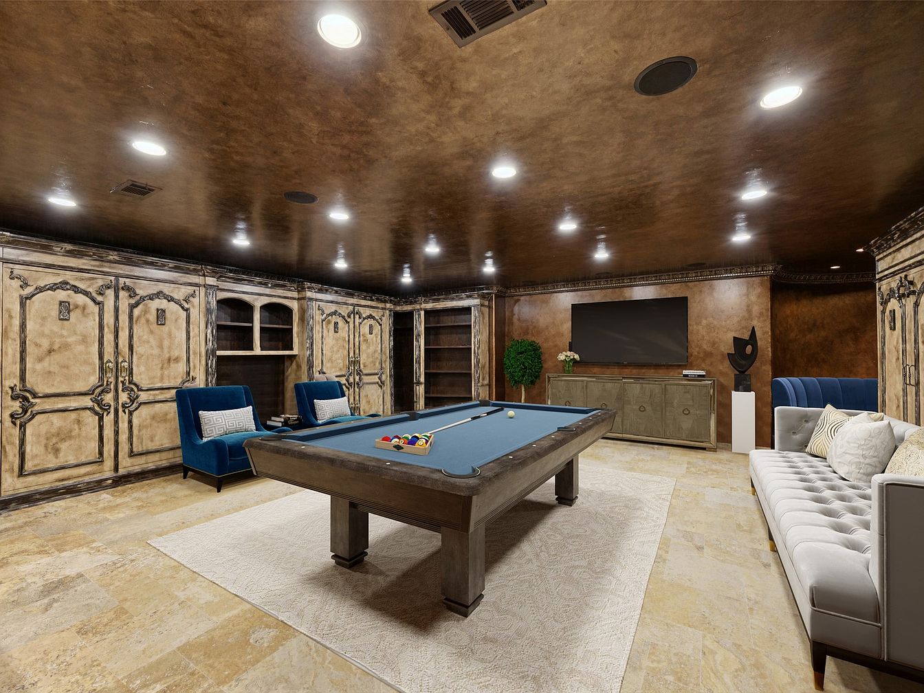This inviting game room boasts a stunning combination of elegance and comfort, perfect for family gatherings or entertaining friends. The rich, textured ceiling complements the stylish cabinetry, adorned with intricate detailing that adds character. A slate blue pool table takes center stage, surrounded by plush, matching armchairs and a sleek, tufted sofa, inviting relaxation. The warm color palette harmonizes with earthy tones and stylish accents, while recessed lighting enhances the ambiance. A modern entertainment unit stands ready for movie nights, paired with artistic decor that underscores a sophisticated yet cozy atmosphere, making it an ideal getaway for leisure.