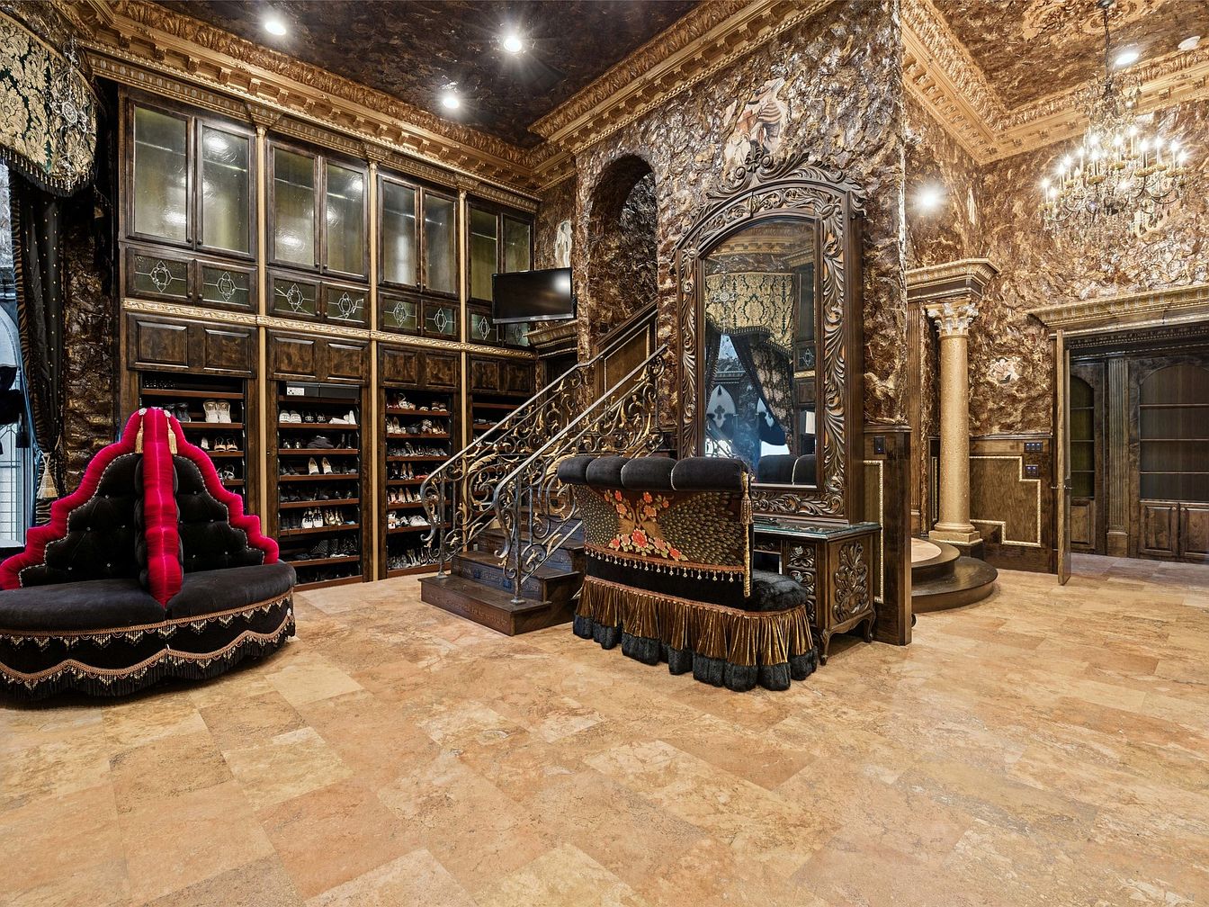This luxurious entryway features a striking blend of ornate details and modern functionality. Richly patterned dark walls are complemented by intricate gold moldings and a stunning chandelier that illuminates the space, creating an inviting atmosphere. The stately curved staircase with decorative wrought iron railings invites guests to explore further. A plush, velvet settee in deep hues offers a cozy spot to unwind, while the custom cabinetry provides practical storage solutions for shoes and accessories. The warm earth-toned flooring adds a touch of elegance, harmonizing beautifully with the sophisticated textures and opulent design elements throughout the space.