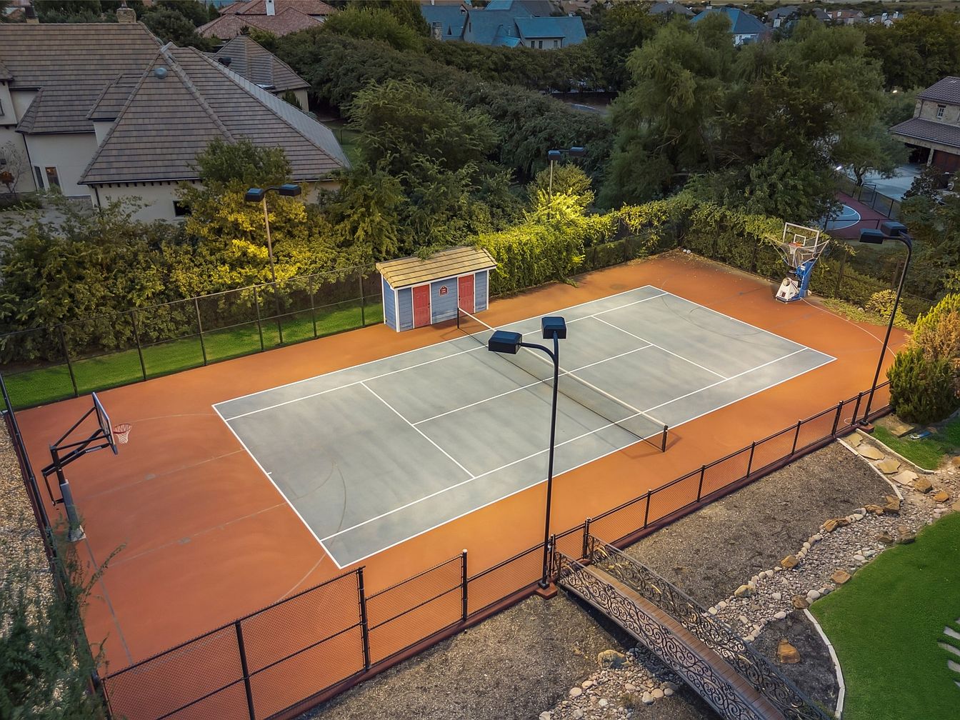 A stunning sports court area designed for active family living. This spacious outdoor setting features a dual-purpose surface that accommodates both basketball and tennis, surrounded by lush greenery and a protective fence for safety. The court is well-lit, making it ideal for evening play. Adjacent, a charming wooden shed adds functionality for storage, while a stylish bridge leads over decorative stones, enhancing the landscape’s aesthetic. The vibrant color scheme of the court, paired with the natural elements, creates an inviting atmosphere perfect for family gatherings and friendly competitions, making it a centerpiece for outdoor recreation.