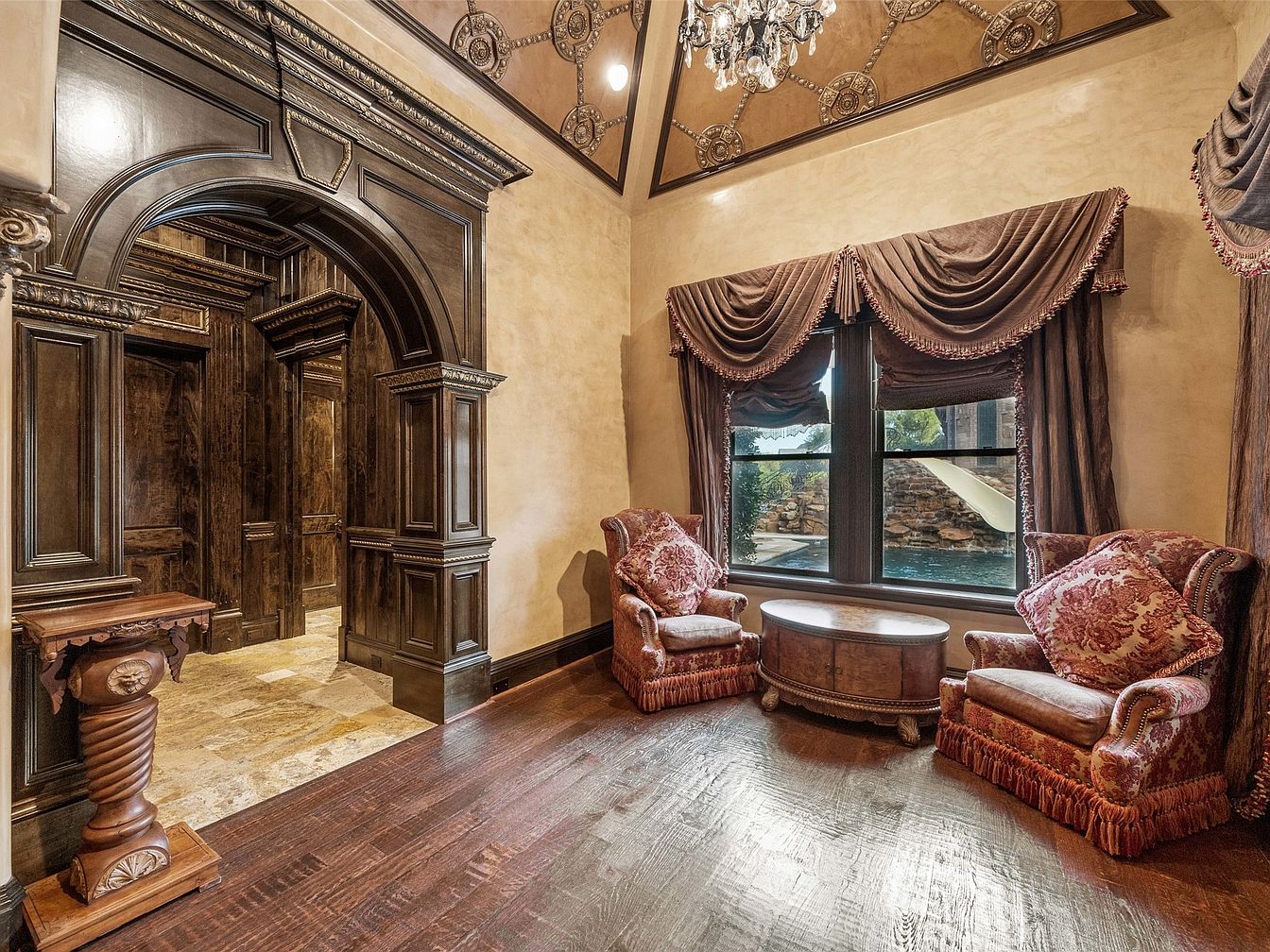 This exquisite sitting nook combines luxury with comfort, featuring two elegantly upholstered armchairs adorned with rich, floral patterns that exude vintage charm. A rounded wooden table sits between them, enhancing the inviting ambiance. The room showcases a stunning archway leading to other parts of the home, framed by ornate woodwork that adds a touch of sophistication. Natural light filters through large windows, dressed with plush drapes that match the chairs, offering picturesque views of the lush outdoor landscape. The warm, earthy color palette, coupled with polished hardwood floors and subtle architectural details, creates a perfect family-friendly retreat.