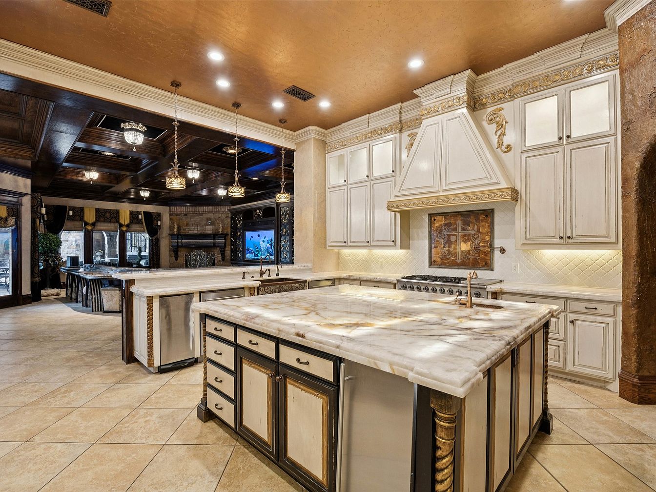 This stunning kitchen showcases a blend of sophistication and functionality, featuring expansive marble countertops that provide ample workspace and striking visual appeal. A large central island enhances the room’s social aspect, perfect for family gatherings. Decorative cabinetry, embellished with intricate gold detailing, complements the warm hue of the coffered ceiling. Soft under-cabinet lighting creates a cozy ambiance, while stylish pendant lights add an elegant touch. The seamless layout connects to an inviting dining area, complete with large windows that flood the space with natural light. Thoughtful design elements ensure this kitchen is both practical and aesthetically pleasing.