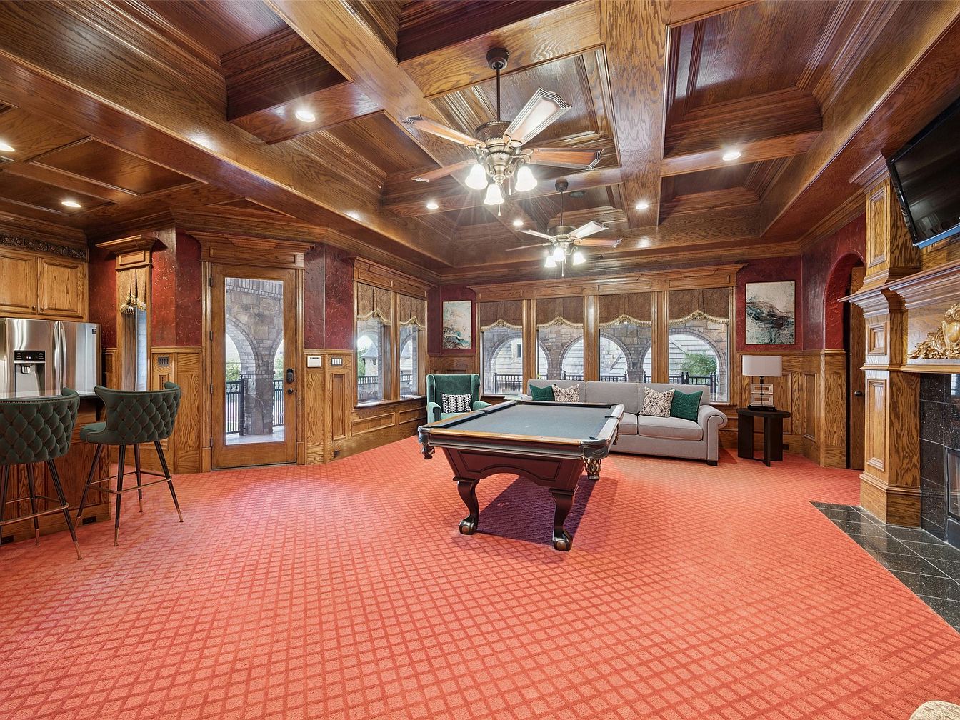 This inviting game room features rich wood paneling and coffered ceilings that exude warmth and sophistication. The plush red carpet complements the elegant decor, while the pool table serves as a centerpiece for entertainment. A comfortable gray sofa, adorned with green accent pillows, invites relaxation. Large windows framed with intricate drapery offer sweeping views and ample natural light. The sleek wet bar, equipped with stylish chairs, adds a modern touch. Family-friendly features abound, from the spacious layout allowing for gatherings to the cozy fireplace that enhances the room’s ambiance. This space is designed for both leisure and elegant hosting.