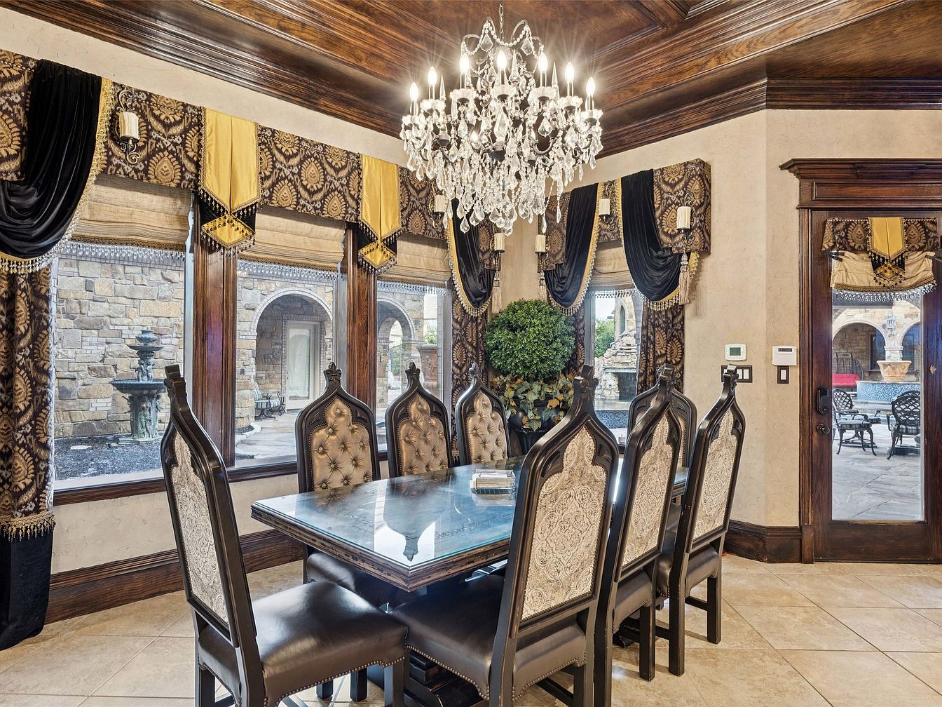 This elegant dining room features a sophisticated wooden ceiling, complementing rich architectural details throughout. A stunning crystal chandelier hangs over the exquisite glass table, flanked by plush, high-backed chairs adorned with intricate upholstery. Dark, luxurious curtains drape gracefully, framing expansive windows that invite natural light and offer views of an inviting courtyard. The decor harmonizes shades of deep gold and black, creating a warm and inviting atmosphere. Family-friendly elements are evident with ample seating and a spacious layout, making it perfect for entertaining guests or enjoying family meals in style. A touch of greenery adds life to the space.