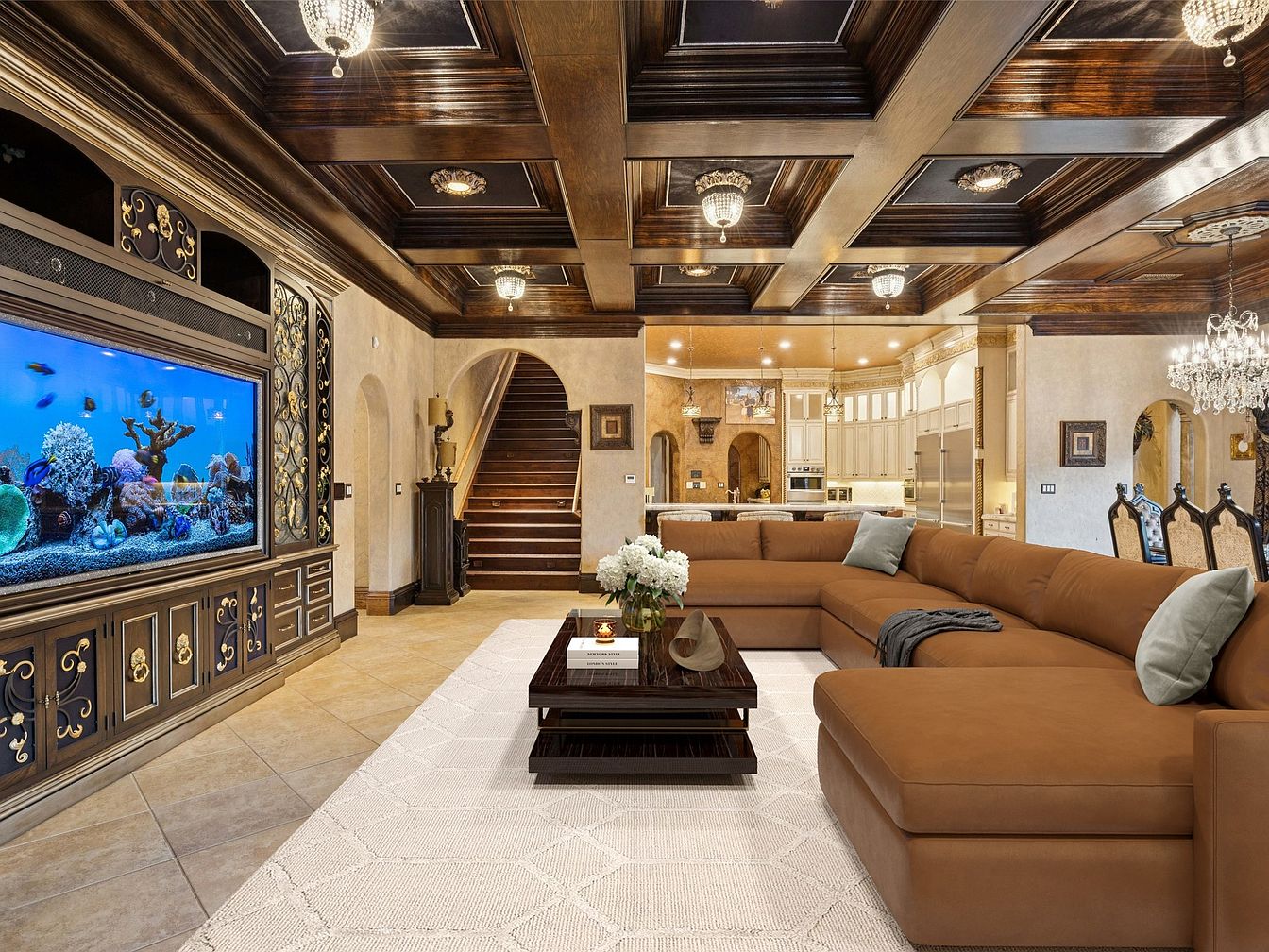 This luxurious living room features a massive sectional sofa with rich, brown upholstery that invites relaxation. An elegant coffee table anchors the space, beautifully complemented by a light, textured area rug that adds warmth. Exquisite coffered ceiling details highlight the architectural sophistication, while contemporary chandeliers provide ambient lighting. The stunning built-in aquarium serves as a lively focal point, adding color and tranquility to the setting. Family-friendly elements are evident in the open layout that encourages interaction, while the adjoining staircase and kitchen further enhance the home’s functionality, making it an ideal space for gatherings and everyday living.