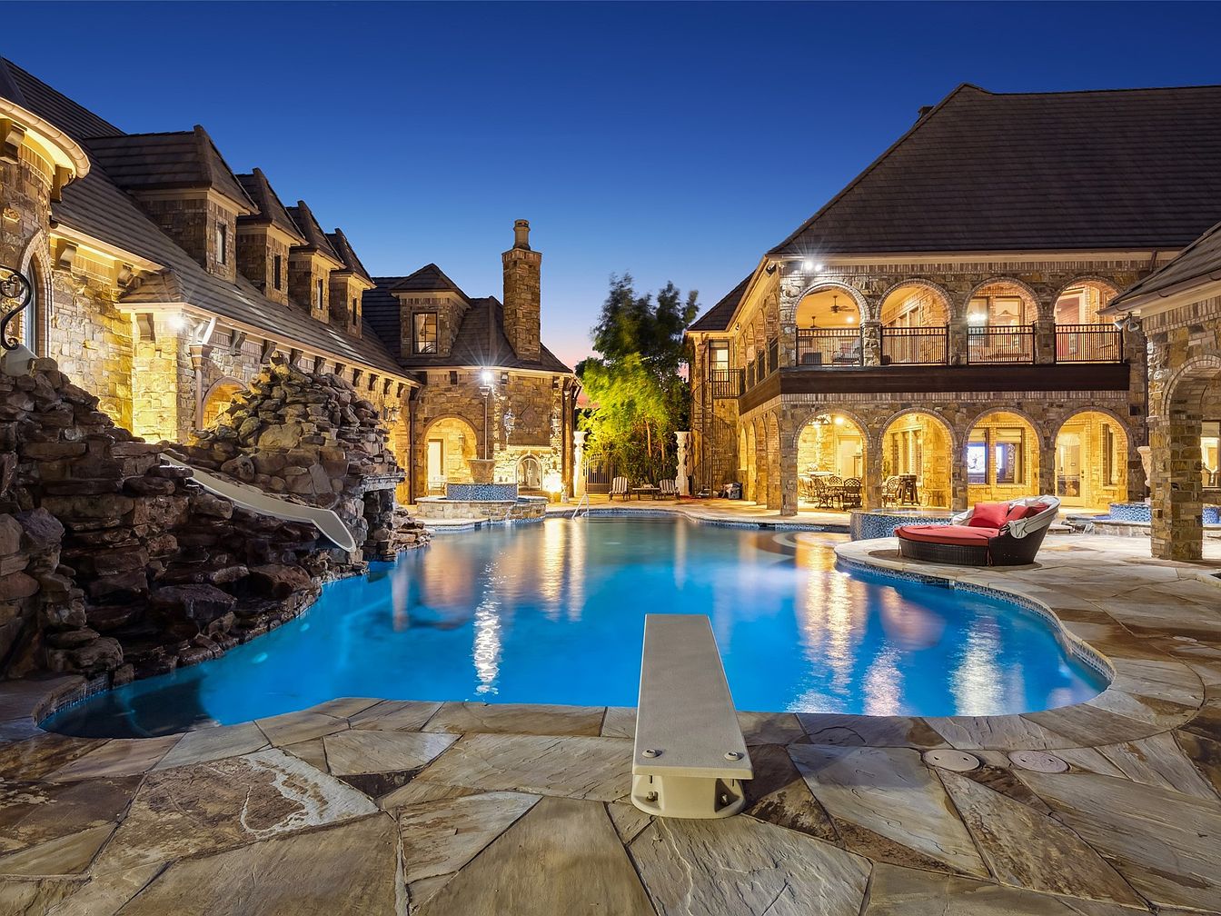 This stunning outdoor pool area features a lavish retreat highlighted by natural stone architecture and soft, ambient lighting. The inviting blue water reflects the evening sky, creating a serene atmosphere. A stylish diving board and a water slide built into a rock formation promise endless fun for families. Cozy seating areas, including a large circular lounge chair, provide perfect spots for relaxation or gatherings. The elegant arches of the home and tiered balconies create a blend of sophistication and comfort, while lush greenery flanks the space, enhancing the overall tranquil vibe, ideal for entertaining or unwinding.