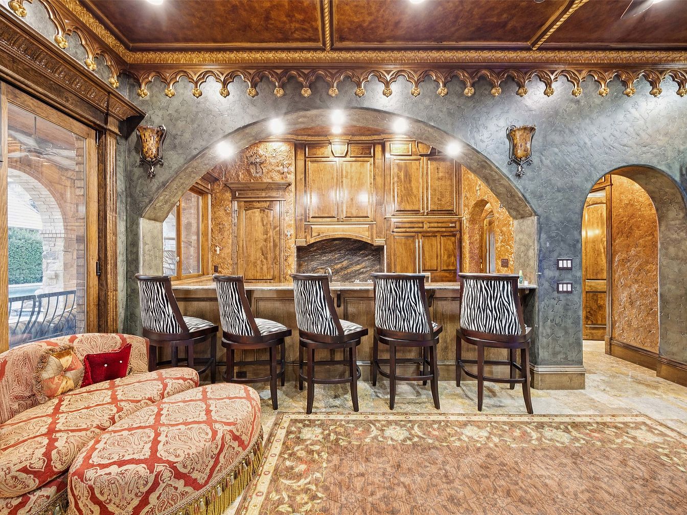 This elegant home bar area exudes sophistication with its rich wood cabinetry and intricate architectural detailing. The layout is open and inviting, featuring a curved bar top complemented by stylish high-backed chairs in a striking zebra pattern. Warm, earthy tones dominate the space, with a blend of neutral walls and luxurious brown accents creating a cozy yet upscale atmosphere. The plush seating area is perfect for relaxation, adorned with ornate pillows that add a touch of color. Stunning lighting fixtures beneath a regal coffered ceiling illuminate the space, while expansive windows invite natural light, ideal for family gatherings.