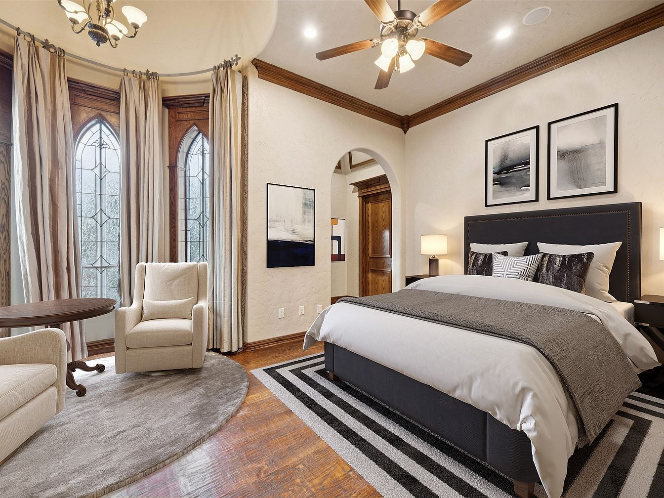 This spacious master bedroom features exquisite architectural details, highlighted by elegant arched windows with intricate glasswork that infuses the space with natural light. Plush seating arrangements, including two chairs and a round table, create an intimate spot for relaxation. A king-size bed, dressed in luxurious linens, sits against a textured backdrop, flanked by contemporary nightstands with soft-glowing lamps. The color scheme blends warm neutrals and dark accents, complemented by a striking black and white area rug. Dark wood trim adds a touch of sophistication, while the ceiling fan enhances airflow, ensuring comfort in this serene sanctuary.
