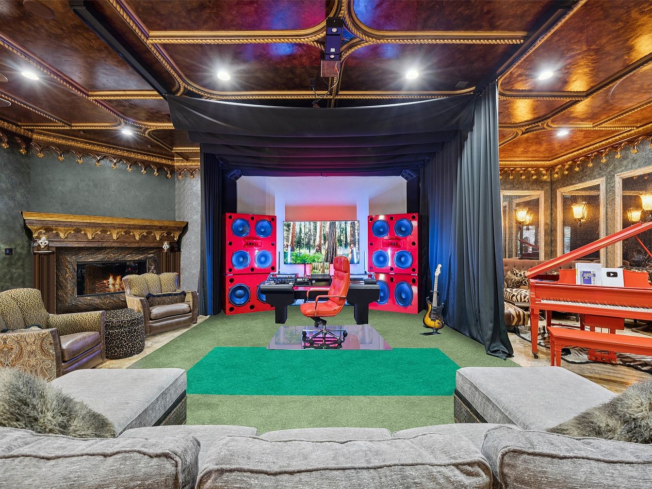 This vibrant music room combines entertainment and comfort with unique design elements. A cozy seating area features plush sofas adorned with luxurious fabrics, while intricate gold detailing on the ceiling adds an opulent touch. The space boasts a striking color scheme of greens, reds, and metallics, highlighted by bold red speakers that create an eye-catching focal point. A sleek black keyboard sits centrally, flanked by an electric guitar and a vibrant red piano, perfect for family music sessions. The warm glow of the fireplace enhances the inviting atmosphere, making it an ideal gathering spot for friends and family.
