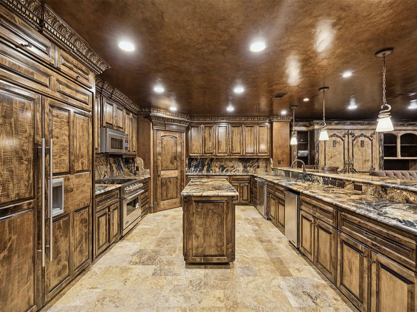 This gourmet kitchen showcases an elegant, rich aesthetic with custom dark wood cabinetry complemented by intricate detailing. The spacious layout features a large central island, perfect for meal prep and casual dining, adorned with stunning granite countertops that echo the warm tones of the cabinetry. High-end appliances, including a professional-grade stove and built-in microwave, offer functionality and a modern touch. Understated pendant lighting casts a welcoming glow, enhancing the ambiance. The durable stone flooring contributes to the room’s practicality, making it family-friendly and ideal for gatherings, all while maintaining a refined yet inviting atmosphere.