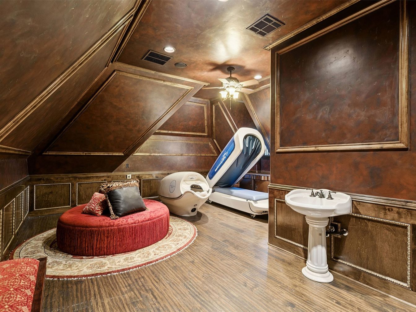 This unique relaxation room features a soothing ambiance with rich, dark wood paneling and an intricately designed ceiling that enhances its cozy atmosphere. A plush, round red ottoman adorned with patterned cushions invites comfort, while a traditional area rug adds warmth and elegance to the space. The sleek, modern spa equipment subtly anchors the room’s health and wellness focus. A stylish white wash basin complements the décor, providing convenience for personal care. The warm, muted color scheme exudes tranquility, making this room an ideal retreat for relaxation, self-care, and rejuvenation, perfectly blending luxury and comfort.