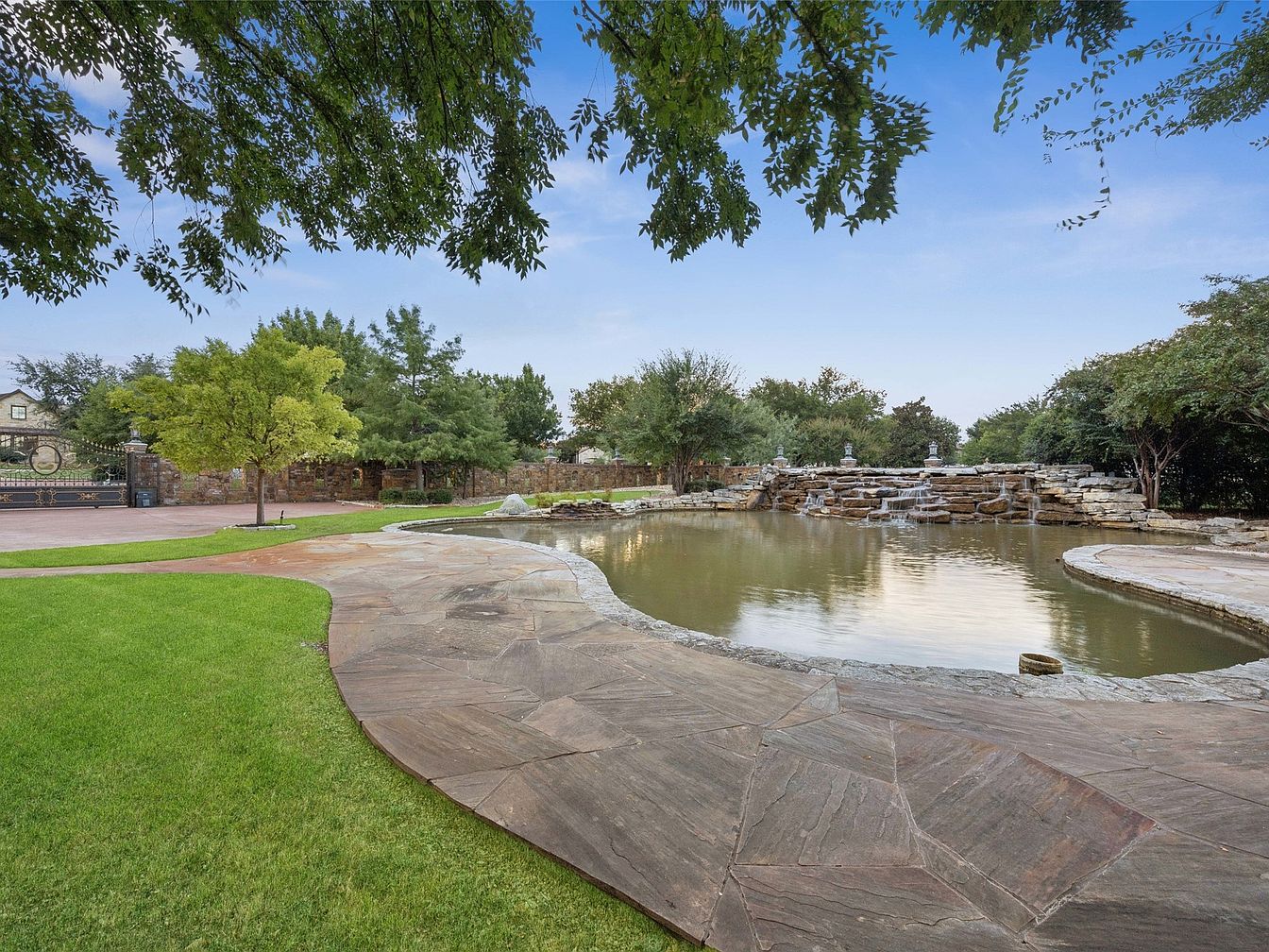 This inviting backyard features a tranquil pond surrounded by lush greenery and beautifully landscaped stone pathways, creating a serene retreat. A natural stone waterfall cascades gracefully, enhancing the peaceful ambiance while providing a soothing sound of flowing water. Ample grassy areas invite family activities, perfect for children and pets to play freely. The combination of vibrant trees and well-placed shrubs adds a splash of color, harmonizing with the earthy tones of the stonework. This outdoor space encourages gatherings and relaxation, making it an ideal setting for entertaining friends or enjoying quiet moments in nature.