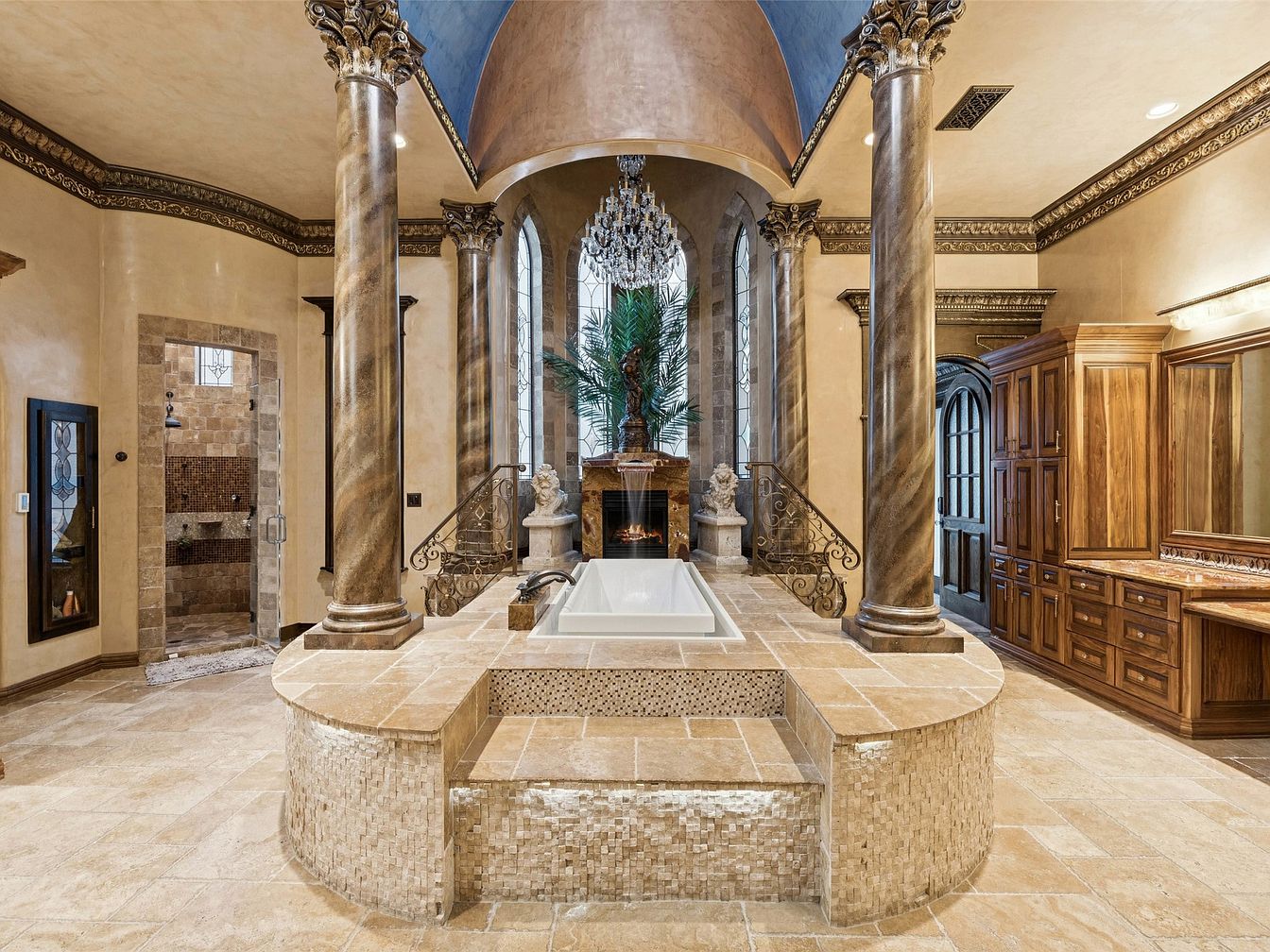 This stunning bathroom features a luxurious layout, showcasing a soaking tub elevated in a curved design, surrounded by exquisite marble tiles. Grand columns frame the space, lending a sense of grandeur, while the intricate crown molding and a sparkling chandelier above add elegance. Rich wooden cabinetry complements the warm color palette, enhancing the inviting atmosphere. A spacious walk-in shower, adorned with textured tiles, provides a functional yet stylish feature. Natural light streams through arched windows, illuminating the lush greenery displayed beside the fireplace, creating a serene and family-friendly sanctuary perfect for relaxation and rejuvenation.