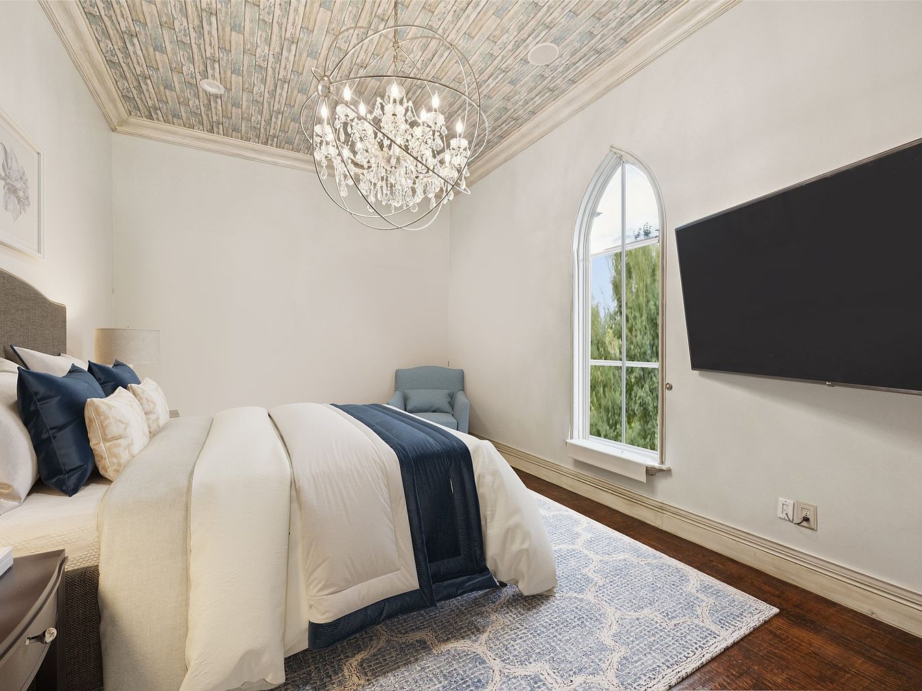 This serene master bedroom features a perfect blend of comfort and elegance. The vaulted ceiling adorned with reclaimed wood adds warmth, complemented by a stunning chandelier that serves as a focal point. The color scheme encompasses soft whites and deep navy, creating a tranquil ambiance. Plush bedding layered with textured pillows invites relaxation. An inviting armchair by the window offers a cozy reading nook, while large, arched windows allow natural light to fill the space and connect it to the outdoors. Sleek furniture and a minimalist design enhance functionality, making this a family-friendly haven for restful nights.