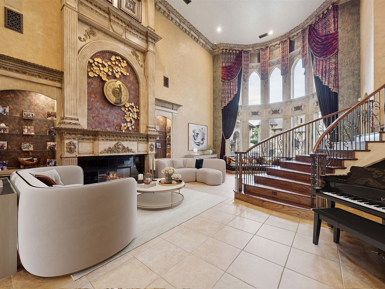 This grand living room boasts soaring ceilings and a stunning array of architectural details. A centerpiece fireplace, adorned with ornate carvings and a decorative clock, creates a welcoming focal point. Luxurious, curved sofas invite comfort, while a plush area rug and stylish coffee table offer cozy functionality. Rich, jewel-toned drapes frame the oversized windows, allowing natural light to cascade in and highlight the exquisite wall textures. The elegant staircase, with its graceful curves and wrought-iron balustrades, adds sophistication. This space is designed for gatherings, blending family-friendly warmth with high-end aesthetics, perfect for entertaining or relaxing.