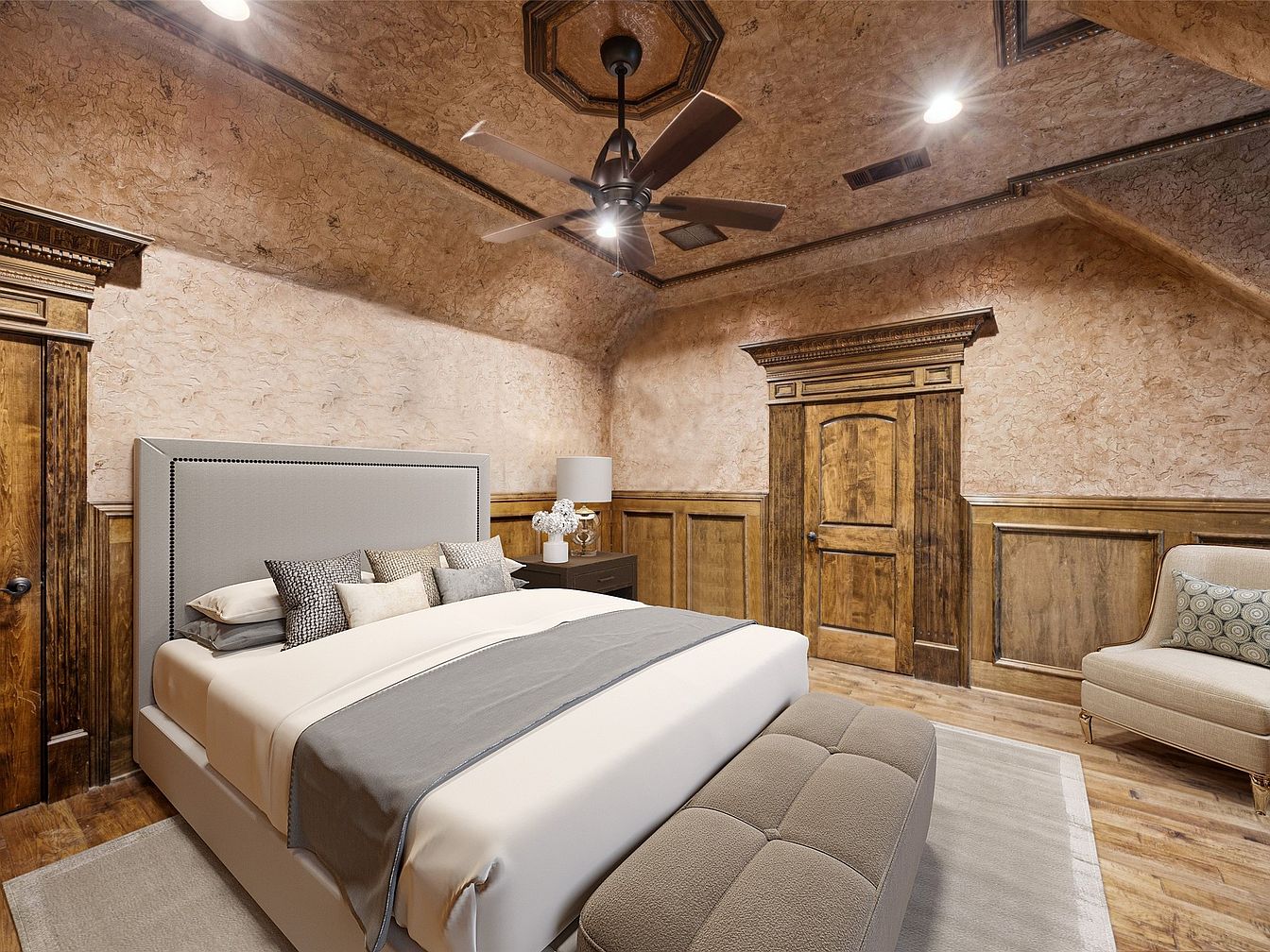 A sophisticated master bedroom features a blend of modern elegance and rustic charm. The vaulted ceiling, adorned with intricate wood detailing, enhances the spacious feel of the room. Warm, neutral tones in the textured wall and wood paneling provide a cozy atmosphere. The plush bed, with a soft gray headboard and layered pillows, invites comfort. A sleek nightstand complements the contemporary style while offering practical storage. A relaxing armchair, infused with subtle patterns, offers a perfect reading nook. With warm wood flooring and tasteful decor, this space radiates an inviting ambiance, ideal for peaceful retreats.