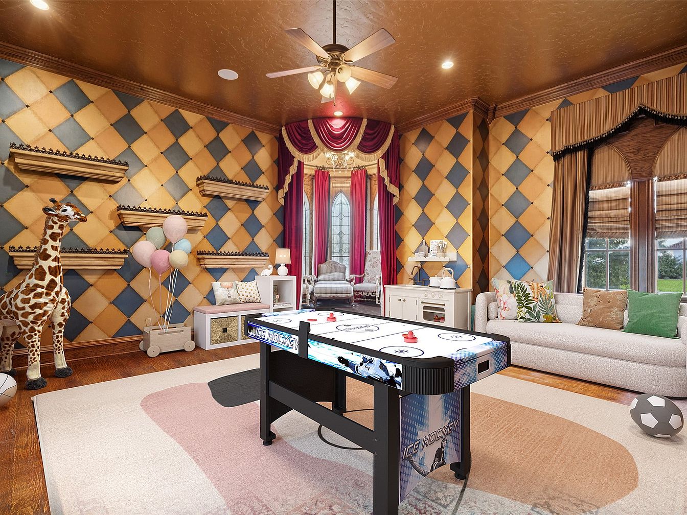 A vibrant playroom designed for family enjoyment, featuring a playful layout with bold diamond-patterned walls in warm yellows and blues. The space includes an air hockey table that sparks excitement, complemented by a soft area rug that adds comfort. Cozy seating options, adorned with colorful cushions, encourage relaxation and family bonding. An elegant window allows natural light to flood the room, enhancing the cheerful atmosphere. Unique shelving provides display space for toys and decorations, while whimsical elements like a giraffe statue and pastel balloons evoke a sense of childhood wonder, making this a perfect retreat for kids.