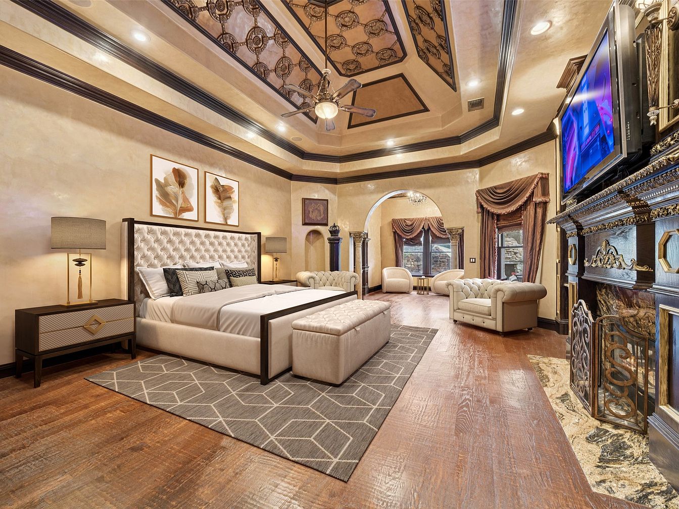 This luxurious master bedroom features a stunning coffered ceiling adorned with intricate detailing, creating an opulent atmosphere. The plush, tufted headboard complements the elegant color scheme of soft earth tones, with cream hues enhancing the space’s warmth. A stylish area rug lies beneath a contemporary king-sized bed, inviting comfort and tranquility. Illuminated by stylish lamps, the room’s ambient lighting highlights the sophisticated furniture, including a chic nightstand. The seating area showcases elegant armchairs, perfect for relaxation. Rich fabrics and detailed moldings speak to quality craftsmanship, making this room an ideal retreat for family leisure and restful nights.