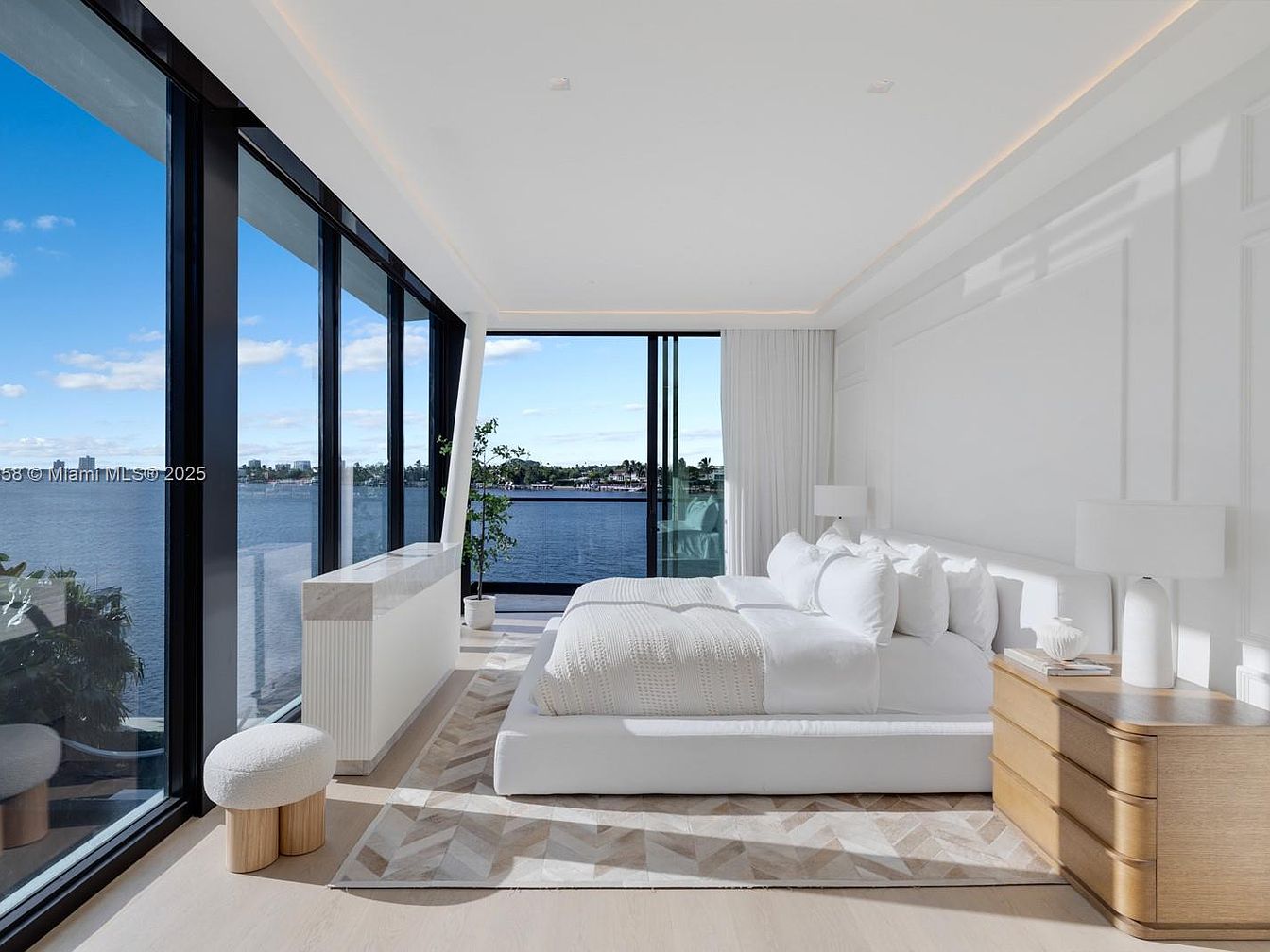 This serene master bedroom features expansive floor-to-ceiling windows offering breathtaking views of the water, seamlessly integrating indoor and outdoor spaces. A soft, neutral color palette enhances the tranquil ambiance, with plush bedding and stylish, minimalist furniture. The focal point is a modern bed framed by elegant decor, highlighting the clean lines and sophisticated design. Natural light floods the room, accentuating the subtle textures of the linens and the unique geometric rug. Family-friendly touches include ample storage and a cozy reading nook, making it an ideal retreat for relaxation, while promoting a harmonious lifestyle.