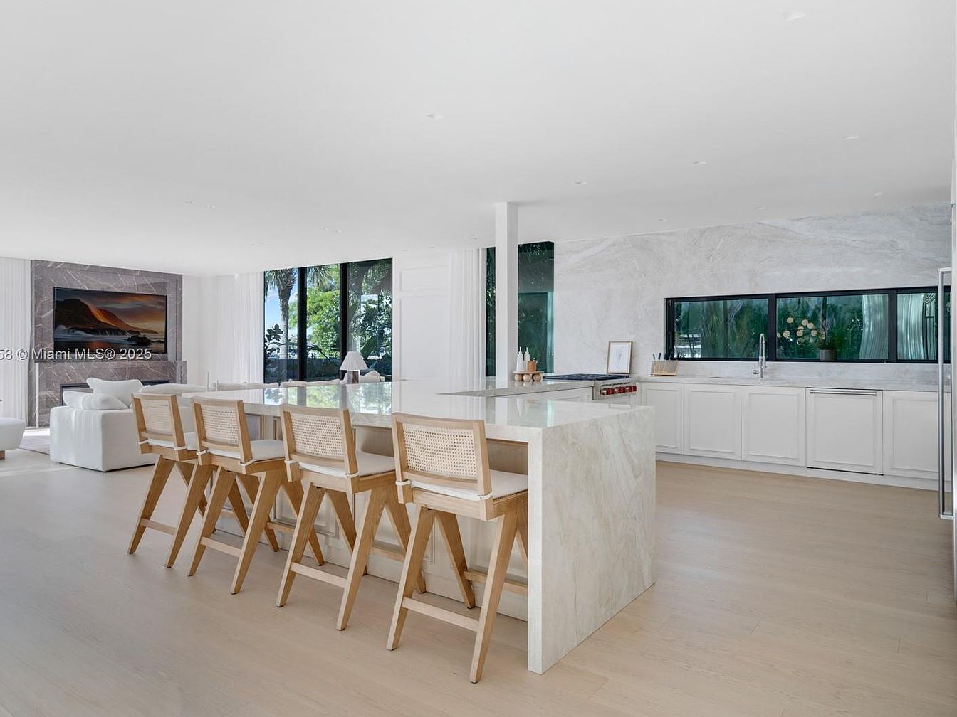 This contemporary kitchen showcases a seamless blend of style and functionality. The expansive layout features a striking island with a sleek marble countertop, providing ample space for meal preparation and casual dining. Light wood accents on the bar stools enhance the bright, airy atmosphere created by large windows that invite natural light. Soft white cabinetry complements the minimalist aesthetic, while the textured stone backsplash adds depth and sophistication. Family-friendly features include easy-to-clean surfaces and a spacious seating arrangement, making it ideal for gatherings. The overall color scheme, with its neutral tones and subtle textures, exudes warmth and elegance.