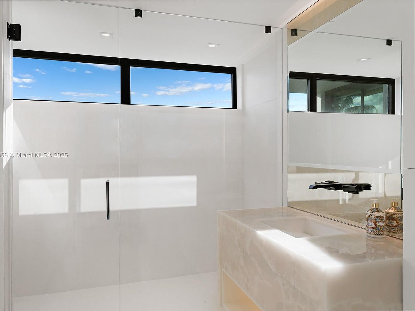 This contemporary bathroom showcases a minimalist aesthetic, featuring sleek white walls that reflect natural light. The open layout enhances the feeling of space and tranquility. A unique, integrated sink is complemented by a stunning countertop that exudes elegance. Stylish black fixtures contrast beautifully with the light surfaces, adding a modern touch. Generous windows provide a scenic view while maintaining privacy, ensuring a refreshing atmosphere. The architectural details, such as the recessed lighting and seamless glass shower, enhance the luxury of the space. This design combines functionality with sophistication, perfect for a family-friendly environment.