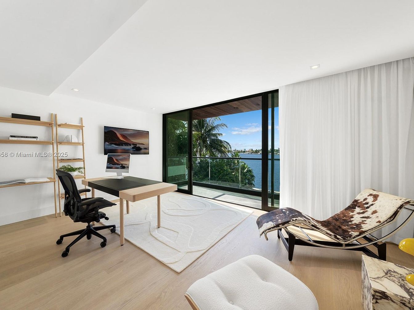 This modern home office features spacious glass walls that invite natural light and stunning waterfront views. The minimalist design incorporates a sleek, black and wood desk paired with a comfortable ergonomic chair, creating an ideal workspace. Behind the desk, a stylish open shelving unit holds decorative items and books, enhancing both functionality and aesthetics. A plush area rug underfoot adds warmth, while a contemporary lounge chair invites relaxation during breaks. The neutral color palette, combined with accent pieces, keeps the atmosphere calm and focused, making this office a perfect blend of productivity and tranquility.