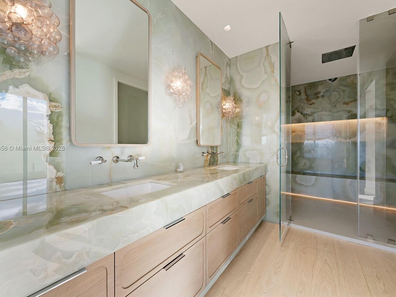 This stunning bathroom boasts a calming aesthetic with its soft green and cream onyx wall panels that create a serene backdrop. The spacious double vanity features a sleek, pale wooden base and radiant stone countertop, harmonizing with the modern design. Two beautifully crafted mirrors are framed elegantly, while sculptural light fixtures add a touch of luxury. A glass-enclosed shower showcases minimalist lines and includes soft, ambient lighting that enhances the tranquil atmosphere. Thoughtfully designed for family use, the open layout promotes accessibility, while stylish finishes ensure this bathroom is both functional and a visual retreat.