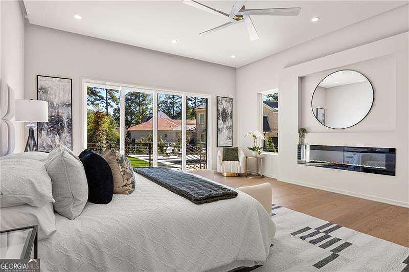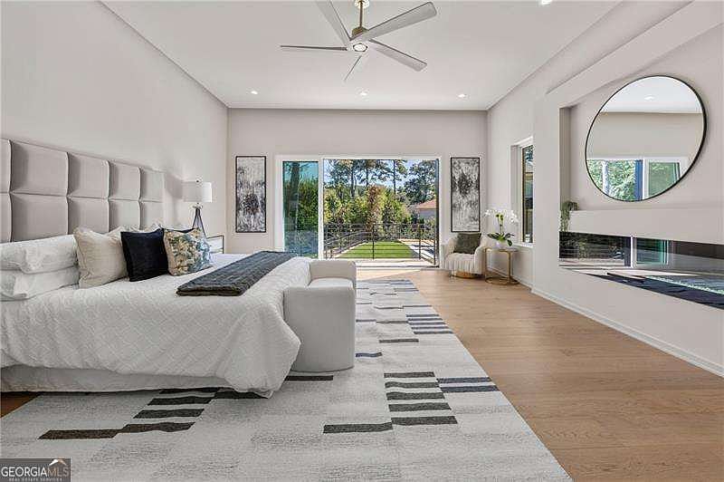 This serene master bedroom boasts a spacious layout with a contemporary design that invites relaxation. Soft natural light floods the room through expansive sliding glass doors, creating an airy atmosphere. The color palette features gentle whites and muted tones, complemented by a cozy, textured area rug that anchors the space. A plush upholstered bed, adorned with decorative pillows, offers an inviting focal point, while a modern ceiling fan ensures comfort. Sleek architectural details, including a minimalist wall mirror and thoughtful decor, enhance the aesthetic. This family-friendly haven provides tranquility, perfect for unwinding and enjoying peaceful mornings.