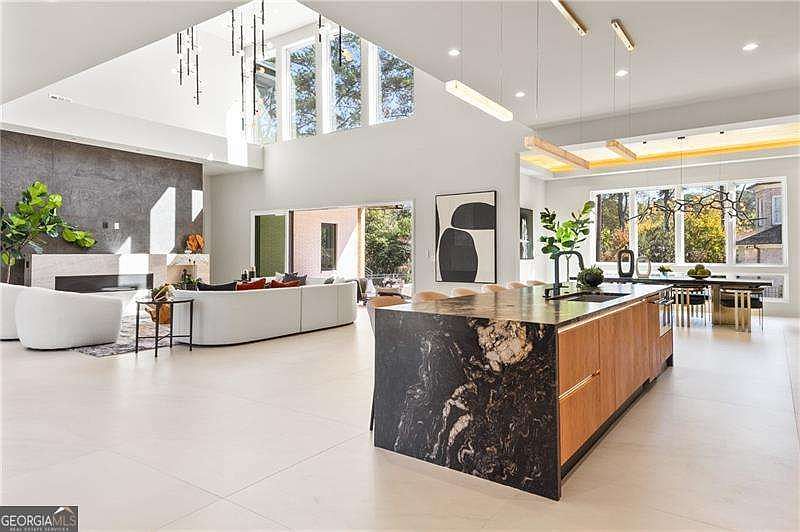 A stunning modern kitchen seamlessly integrates with a spacious living area, characterized by high ceilings and expansive windows that invite natural light. The island showcases a striking blend of dark marble and warm wooden finishes, serving both as a functional workspace and a gathering point. Sleek cabinetry and minimalistic décor enhance the contemporary aesthetic. Family-friendly features include ample seating, a dining area with stylish chairs, and a vibrant indoor plant that adds a touch of greenery. The neutral color palette is accented by bold artwork, creating a perfect atmosphere for both casual family moments and entertaining guests.