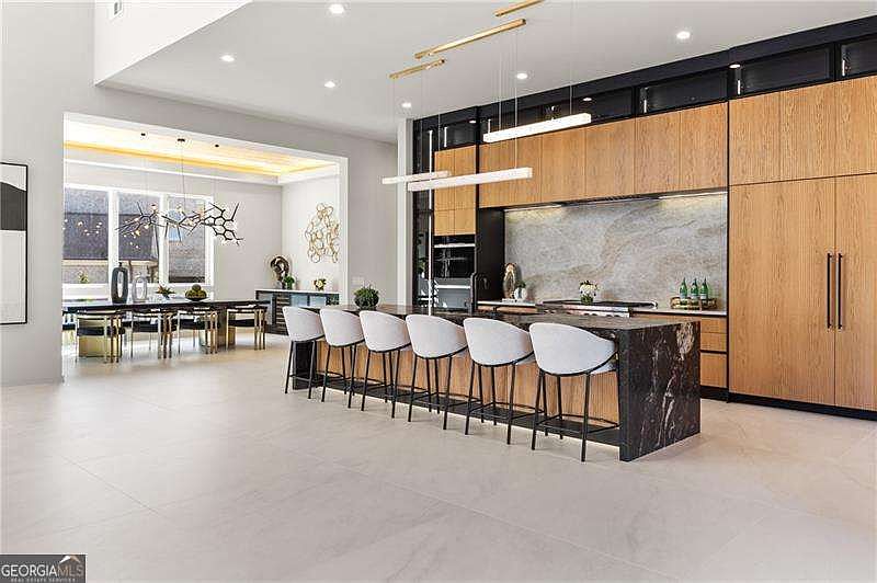 This kitchen showcases a sophisticated blend of modernity and warmth, featuring sleek cabinetry in a soft wood finish paired with bold black accents for a contemporary flair. The spacious layout includes an expansive island topped with luxurious dark marble, providing ample seating for family and guests. Bright, pendant lighting illuminates the space, highlighting the elegant fixtures. A seamless connection to the dining area, adorned with stylish decor and large windows, fosters an inviting atmosphere. The neutral color palette, accented with natural elements, ensures a harmonious and family-friendly environment, perfect for both cooking and entertaining.