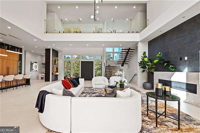 This expansive great room showcases a blend of modern elegance and comfort. The high ceilings add an airy feel, complemented by natural light streaming through large windows. A contemporary white sectional sofa, adorned with plush pillows, invites relaxation. The artistic area rug grounds the space, while a sleek coffee table adds sophistication. Rich wooden cabinetry features prominently, harmonizing with stylish bar stools at the kitchen peninsula, making it ideal for family gatherings. The staircase, with its minimalist design and glass railing, leads to an upper level, enhancing the open-concept layout. A chic fireplace and lush green plants add warmth and life.