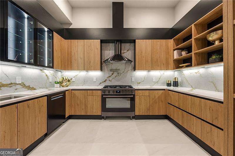A contemporary kitchen featuring a harmonious blend of warm wood cabinetry and sleek black accents creates a striking visual appeal. The spacious layout is designed for efficiency, with ample counter space and modern appliances seamlessly integrated. A stunning marble backsplash adds an elegant touch, highlighted by under-cabinet lighting that enhances the overall ambiance. Open shelving showcases decorative items, adding a personal feel while promoting organization. The polished tile flooring ensures easy maintenance, making this kitchen family-friendly and inviting. Ideal for both casual gatherings and culinary adventures, this space embodies modern luxury with practical functionality.