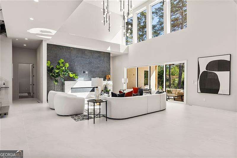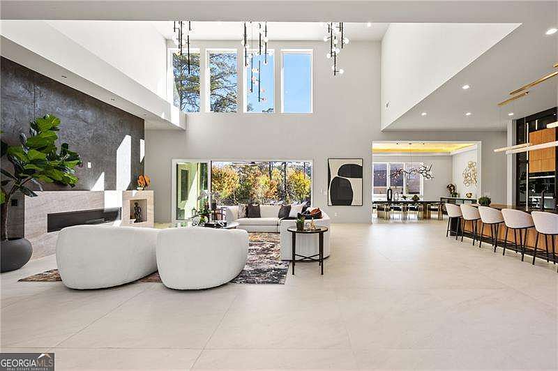 This expansive open living space features towering ceilings that create an airy ambiance. A striking dark feature wall contrasts beautifully with the soft, neutral tones throughout, enhancing the modern aesthetic. Plush, rounded couches offer comfort, complemented by a chic area rug that grounds the seating area. Large windows fill the room with natural light, providing stunning views of the outdoors. A sleek dining area transitions seamlessly into the kitchen, showcasing elegant cabinetry and bar seating. Thoughtful architectural details, such as pendant lighting and a cozy fireplace, foster a welcoming atmosphere ideal for family gatherings and entertaining.