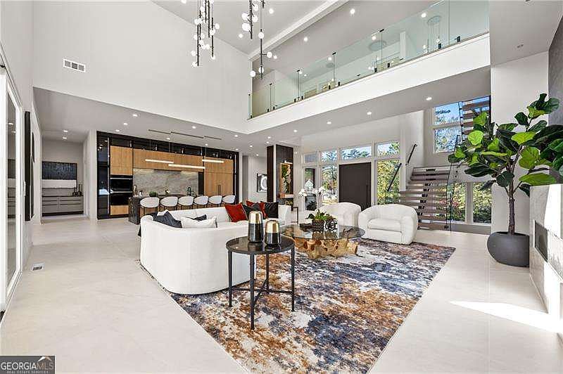 This stunning open living space seamlessly blends modern design with warmth, featuring high ceilings that create an airy atmosphere. The color palette of whites and warm wood accents enhances the inviting feel. Plush, rounded sofas are paired with a striking area rug adorned with rich blues and golds, perfect for family gatherings. An elegant glass coffee table serves as a focal point. Natural light pours in through expansive windows, illuminating the sleek kitchen with its contrasting dark cabinetry and inviting dining area. A stylish staircase leads to a second level, adding to the home’s sophisticated architectural appeal.