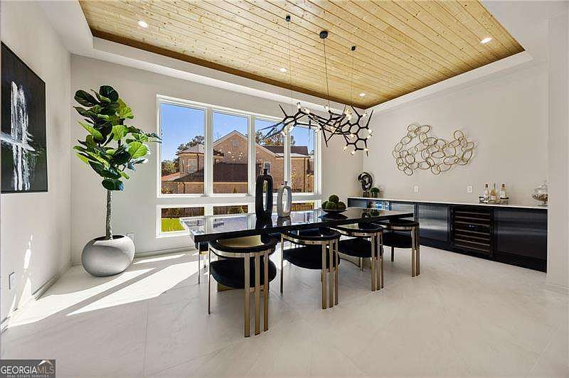 This inviting dining room features a spacious layout adorned with large windows that flood the space with natural light, emphasizing the airy ambiance. The stunning wooden ceiling adds warmth, contrasting beautifully with the sleek, modern furnishings. A long, glossy black dining table is complemented by stylish circular chairs, creating a perfect setting for family meals or entertaining guests. Decorative accents like a sculptural chandelier and unique wall art enhance the contemporary aesthetic. A lush potted plant brings a touch of nature indoors, while a bar area against one wall provides convenience for gatherings, making it a family-friendly haven.