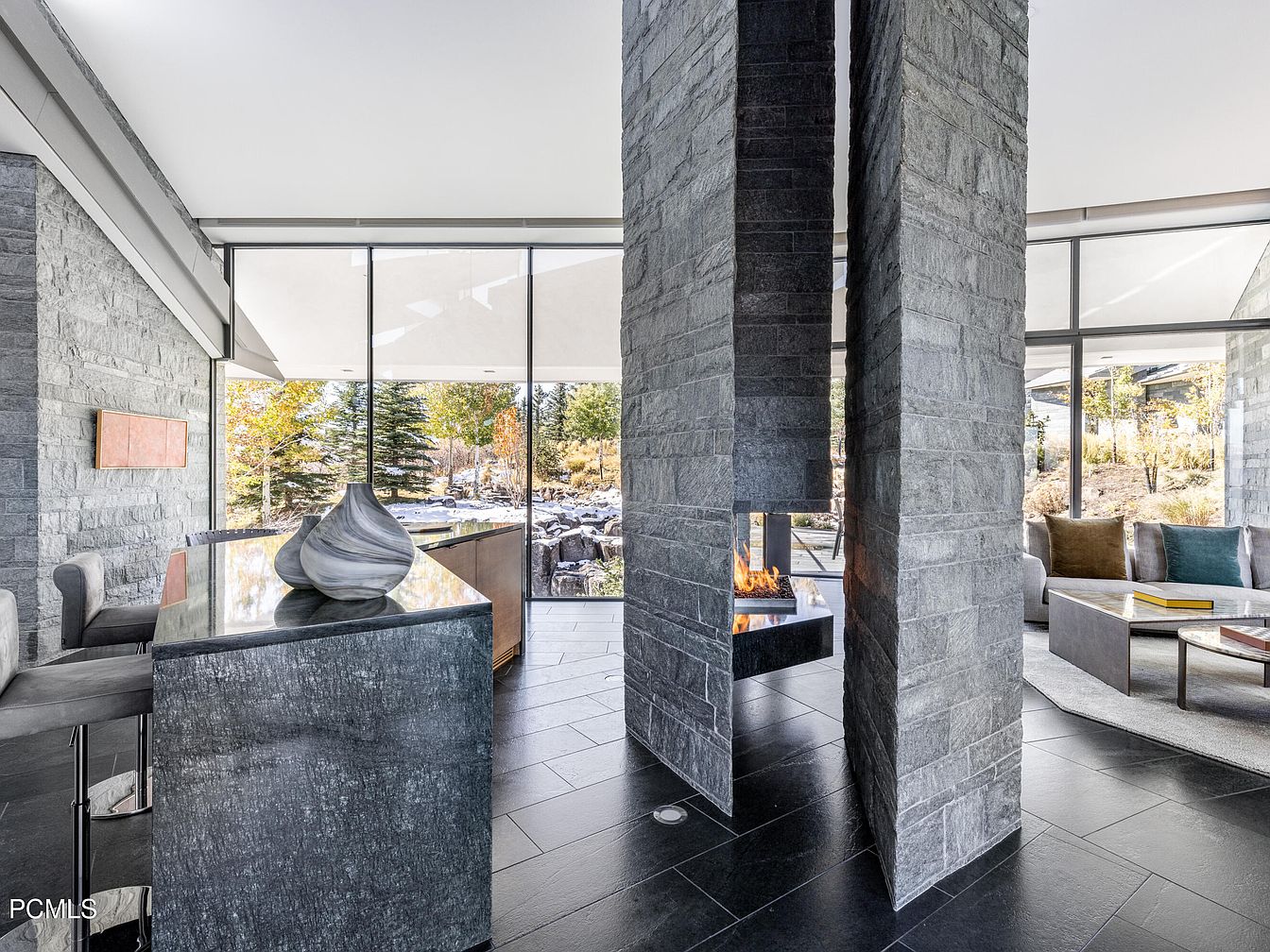 This stunning modern living space showcases an open floor plan with an emphasis on natural light and connectivity to the outdoors. Sleek, stone walls provide a warm yet contemporary backdrop, seamlessly transitioning into expansive glass windows that frame picturesque views of the surrounding landscape. The centerpiece is a minimalist fireplace, crafted from natural stone, providing both warmth and aesthetic appeal. The color scheme boasts cool grays accented by rich, earthy tones in the furnishings, enhancing the cozy yet sophisticated atmosphere. With stylish bar seating and a plush seating area, this space is perfect for family gatherings or serene evenings.