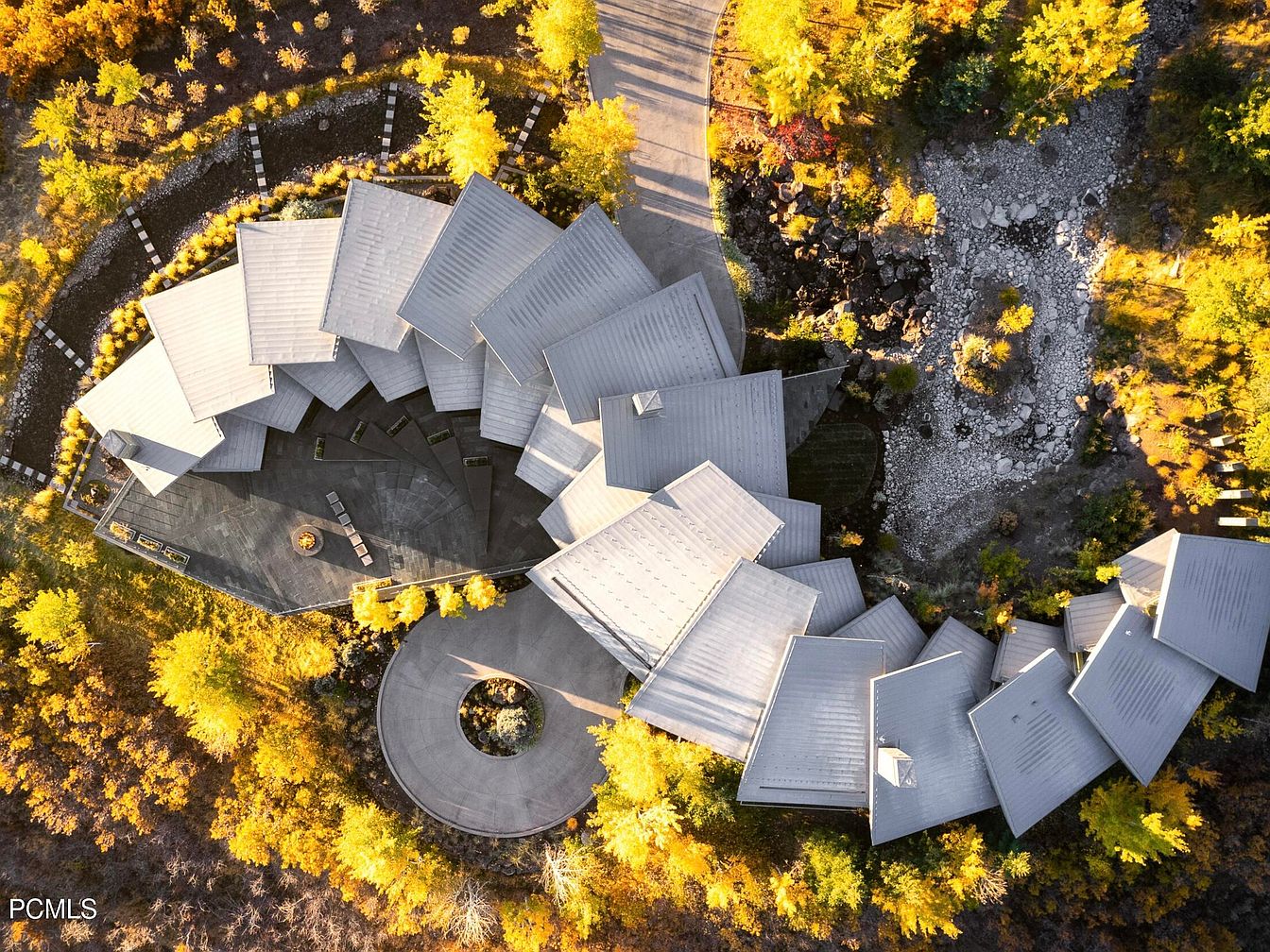 An impressive aerial view of a modern home features a striking, asymmetrical roof design that mirrors the surrounding landscape. The structure is embraced by vibrant autumn foliage, creating a warm, inviting atmosphere. A circular driveway leads to the entrance, complemented by elegantly designed pathways and well-placed landscaping that enhances the natural beauty. The exterior showcases a harmonious blend of materials, with steel roofing and contrasting stone elements. Large windows invite sunlight while providing panoramic views of the lush surroundings. This home exemplifies innovative architecture, seamlessly merging indoor and outdoor living for a family-friendly environment.