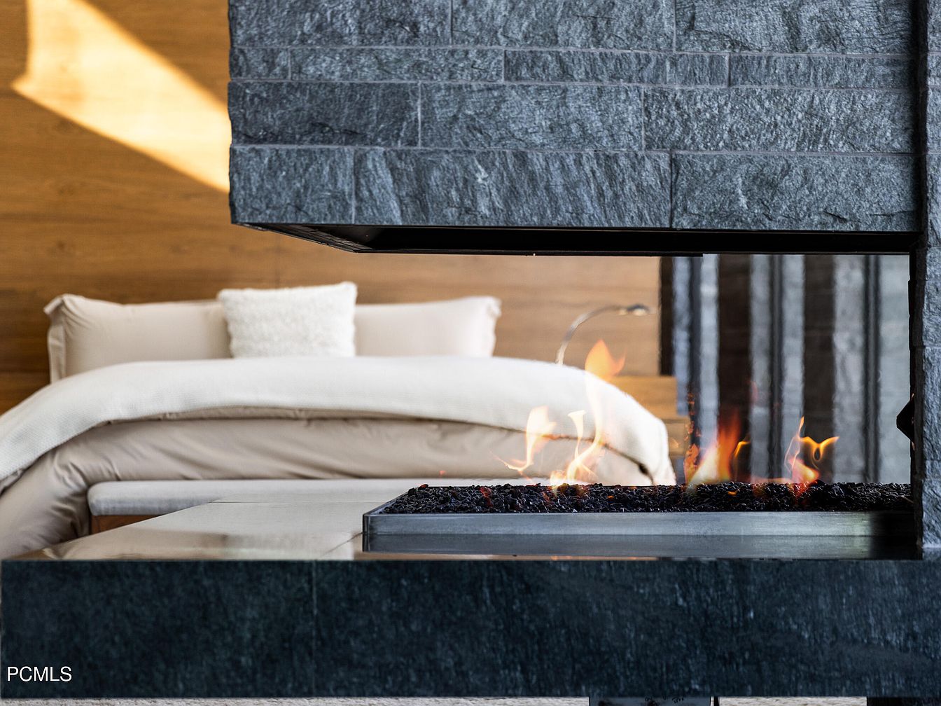 This inviting bedroom exudes modern elegance, featuring a striking dual-sided fireplace that beautifully separates the sleeping area and living space. The warm wooden accent wall behind the plush, inviting bed adds a touch of natural coziness and warmth to the room. A soft, neutral color palette enhances the serene atmosphere, with layered bedding and decorative pillows adding depth and comfort. Sleek, contemporary furniture complements the overall design, while the flickering flames from the fireplace create an ambiance perfect for relaxation. This space seamlessly combines style and comfort, making it ideal for family gatherings or quiet evenings.