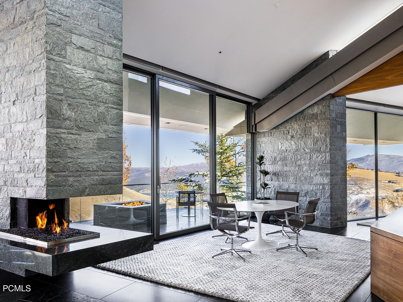 This stunning dining area features a sleek round table surrounded by contemporary chairs, perfectly placed on a soft area rug. The modern design harmonizes with the stone fireplace, which serves as a striking focal point, radiating warmth against the backdrop of large glass windows that invite natural light and stunning mountain views. The color scheme of neutral tones enhances the welcoming atmosphere, complemented by rich textures of stone and wood. The open layout promotes a family-friendly environment, allowing seamless interaction between spaces, ideal for gatherings and shared meals, all while embracing the beauty of nature outside.