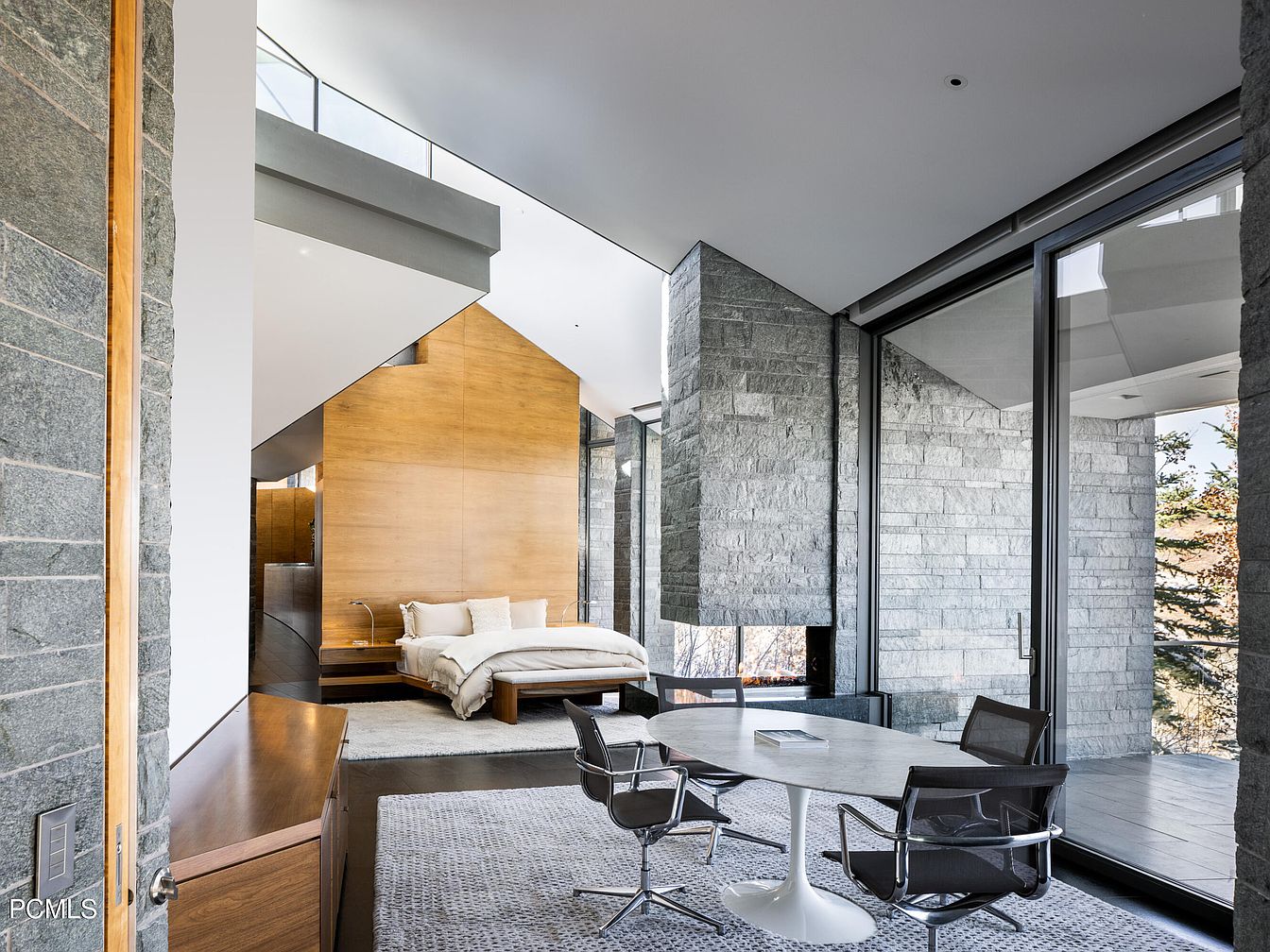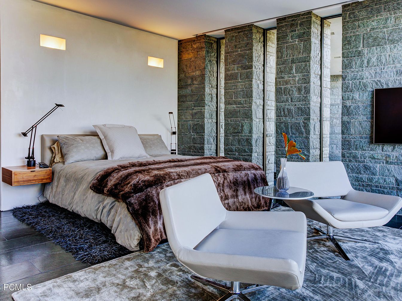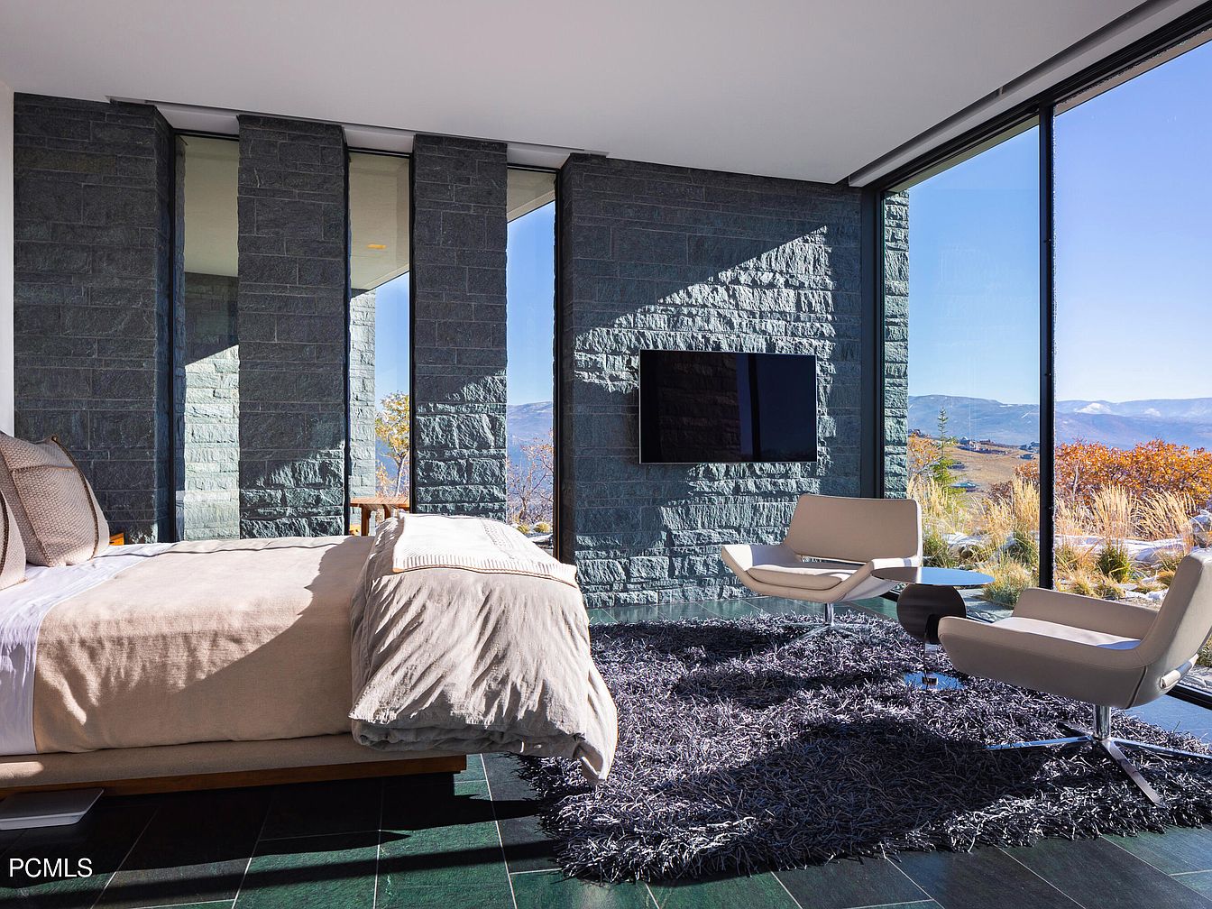 This modern bedroom combines sleek design with comfort, featuring large windows that frame breathtaking views of the surrounding landscape. The earthy stone walls create a cozy atmosphere, complemented by soothing neutral tones throughout. A plush, oversized bed occupies the focal point, adorned with soft linens and decorative pillows, inviting relaxation. Beside it, minimalist chairs provide a perfect spot for morning coffee or evening reading. A plush area rug adds warmth underfoot, enhancing the room’s inviting feel. Architectural lines are clean and contemporary, promoting an open and airy layout. This space is an oasis for retreating from daily life.
