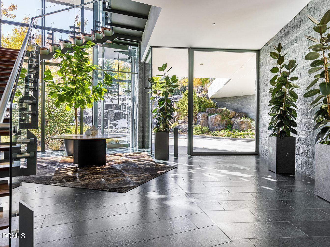 A striking entryway features a modern staircase with wooden treads and glass railings, creating an open, airy feel. Natural light floods in through expansive windows, accentuating the sleek slate flooring and textured stone walls. A round, minimalist table sits on a contemporary geometric rug, serving as a stylish focal point. Lush greenery is positioned symmetrically in chic planters, adding a touch of nature and warmth. The color palette combines earthy tones with subtle contrasts, promoting a welcoming ambiance. This space is designed for both form and function, perfect for family gatherings and making memorable first impressions.