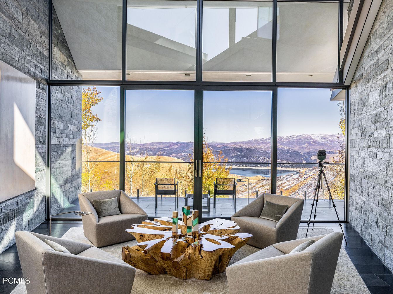 This chic living area boasts floor-to-ceiling windows that flood the space with natural light, offering stunning panoramic views of rolling hills and shimmering waterways. The minimalist design features sleek, angular furniture in soft beige tones, complemented by a unique wooden coffee table that serves as a statement piece with its organic shape and natural finish. Textures play a key role, from the plush area rug beneath to the smooth stone wall, highlighting artisanal craftsmanship. Ample seating invites family gatherings, while the open layout encourages seamless interaction, making this an ideal sanctuary for relaxation and entertaining.