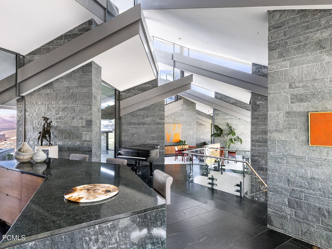 This contemporary living space exudes elegance and modern design, showcasing a clever layout that encourages both interaction and relaxation. A striking granite countertop serves as a focal point, paired with plush seating that invites family gatherings. The color palette harmonizes soft grays with natural stone textures, complementing large glass windows that flood the area with natural light. Architectural beams stretch across the ceiling, enhancing the open feel while adding visual interest. Sculptural elements and vibrant artwork introduce personal touches that resonate with a creative lifestyle, making this space both stylish and family-friendly.