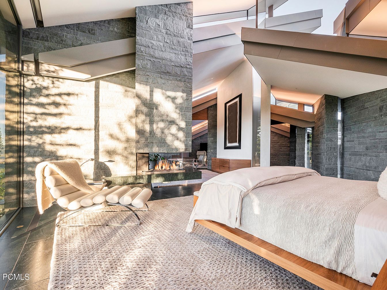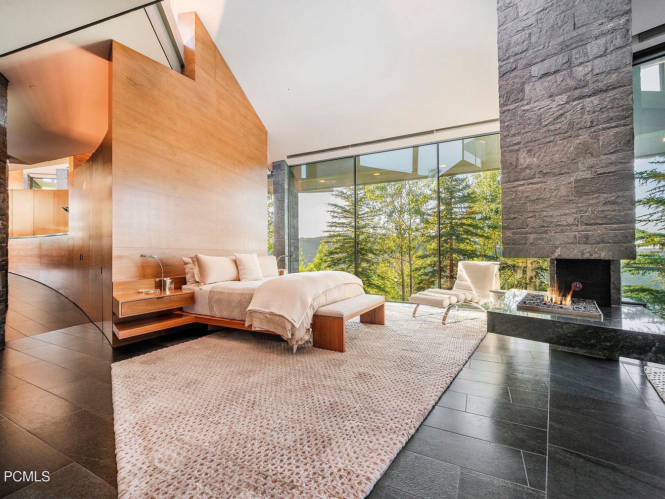 A spacious master bedroom features sleek lines and natural elements, creating a serene retreat. The warm wood paneling complements the soft, neutral color palette, enhancing the cozy ambiance. An elegant floating bed is paired with minimalist nightstands, emphasizing functionality without sacrificing style. Expansive glass walls flood the room with natural light and offer stunning views of the surrounding landscape. A dramatic stone fireplace adds a touch of luxury, while the plush area rug provides comfort underfoot. The carefully curated furniture layout promotes effortless movement, making this a perfect family-friendly sanctuary designed for relaxation and tranquility.
