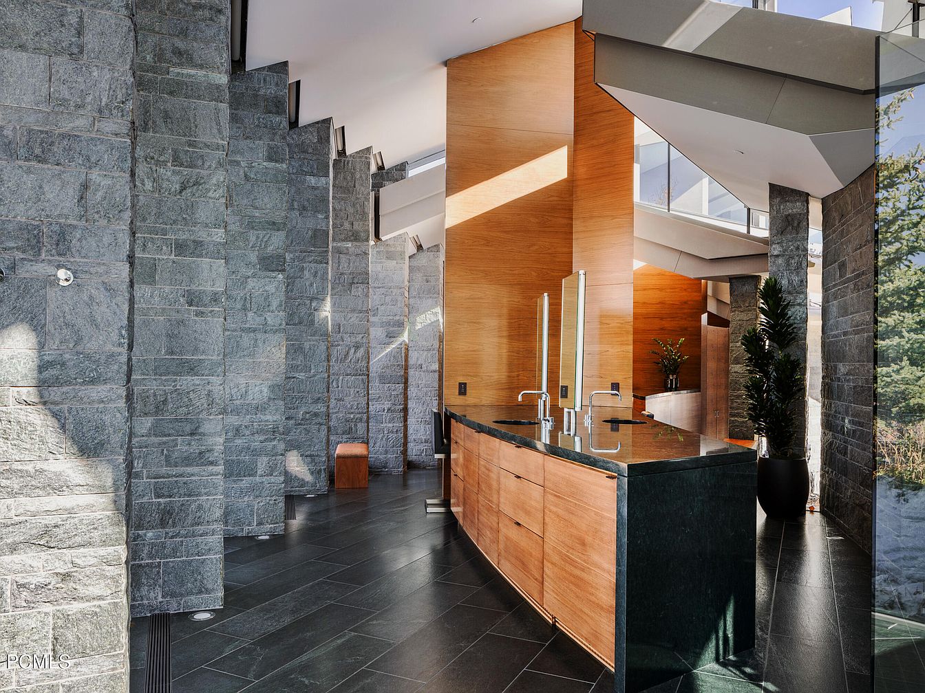 This stunning bathroom showcases a harmonious blend of natural materials and contemporary design. The striking gray stone walls create a bold contrast against the warm wooden cabinetry, enhancing the inviting atmosphere. A sleek, dark stone countertop perfectly complements the minimalist fixtures, emphasizing functionality without sacrificing style. Generous windows flood the space with natural light, highlighting the elegant lines and open layout. Thoughtfully placed greenery adds a touch of freshness, making it family-friendly and relaxed. The polished slate flooring offers durability while ensuring comfort. This space is a perfect retreat for relaxation and rejuvenation.