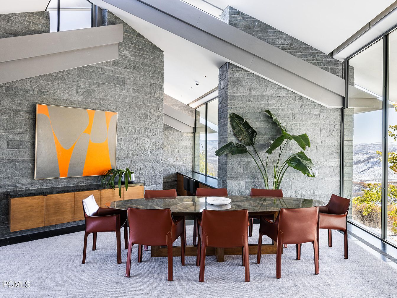 Featuring a stunning dining area that blends modern aesthetics with warmth, this space showcases a circular marble dining table surrounded by chic, leather-clad chairs in rich burgundy tones. The room is accentuated by a dramatic stone wall that evokes a sense of tranquility and strength. Large windows invite natural light, offering panoramic views of the surrounding landscape, while a vibrant abstract artwork adds a splash of color, enhancing the contemporary feel. The sleek, gray-beamed ceiling and plush carpeting create a cozy yet sophisticated atmosphere, making it an ideal gathering spot for family and friends.